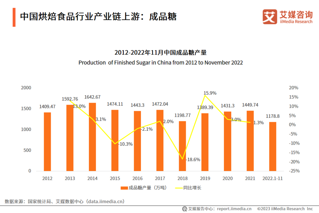 数据显示,2012-2021年中国成品糖产量有所波动,但基本维持在1400万吨左右。2022年前11月中国成品糖产量达1178.8万吨,同比增长0.5%。艾媒咨询分析师认为,虽然成品糖是烘焙食品主要原材料,但烘焙食品行业已出现使用木糖醇等代糖的趋势。未来其他甜味剂使用比例上升,可能降低烘焙食品行业对传统糖类的依赖性。