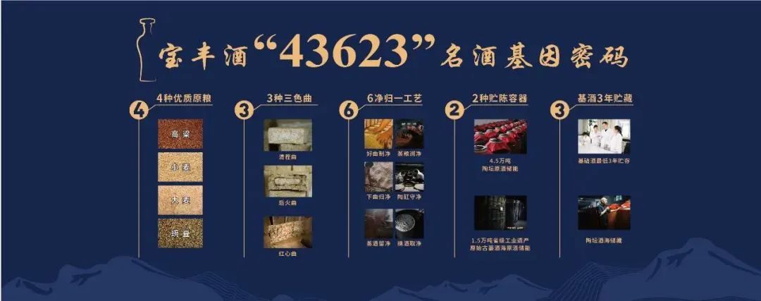 宝丰酒传承自北宋时期的程氏六艺酿造法,千年来一脉相承,在传承中创新,精进为宝丰“六净归一”工艺价值体系,2008年更是入选国家非遗名录。“43623”名酒基因密码从粮、曲、艺、器、藏5各方面全面揭秘宝丰酒的高品质秘密。