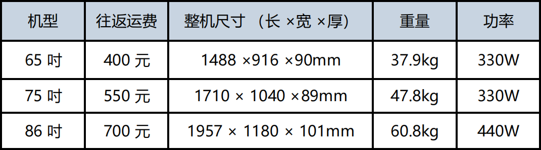 https://wdb-client.cvte.com/55de523f65974fab99c3a85730b20本次展会期间seewo希沃触控一体机及其他屏显设备借用不收取租赁费用,但借机公司需自行承担物流往返费用,3月25日后希沃公司同事将联系对接人签署希沃公司提供的借机协议,作为本次展会借机凭证。触控一体机设备单台往返运费及设备规格 (加壁挂厚度增加30mm) 如下: