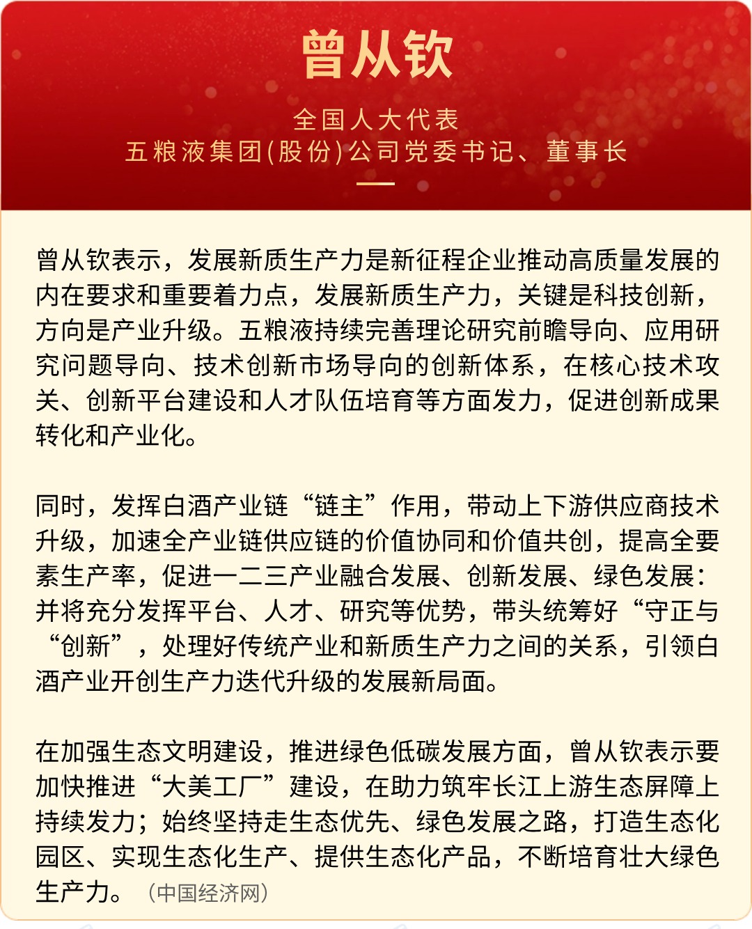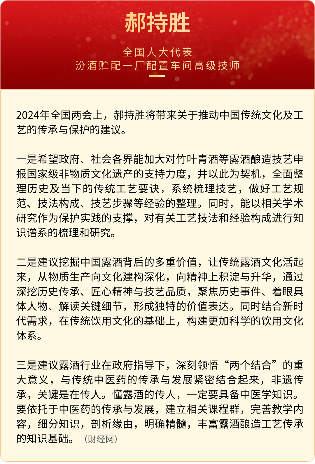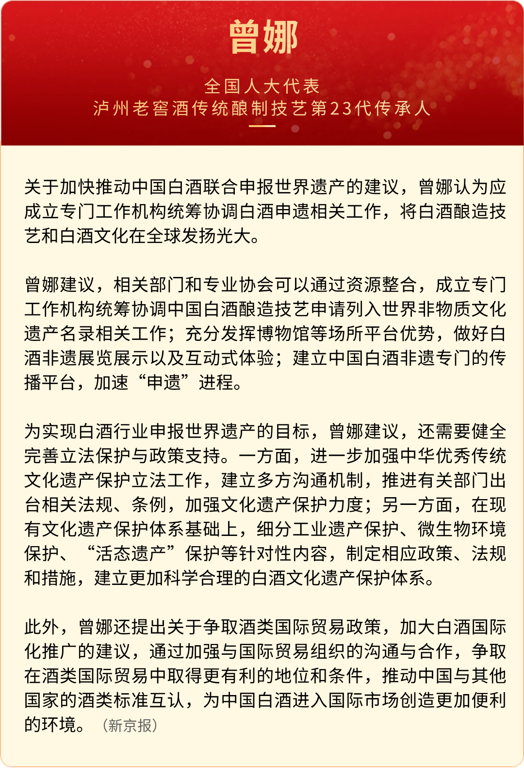 全国“两会”期间,全国人大代表,中国贵州茅台酒厂(集团)有限责任公司党委书记、董事长丁雄军;全国人大代表,五粮液集团(股份)公司党委书记、董事长曾从钦;全国人大代表、泸州老窖酒传统酿制技艺第23代传承人曾娜;全国人大代表,山西杏花村汾酒厂股份有限责任公司贮配一厂配置车间高级技师郝持胜等带来了关于酒业和其他领域的建议。
