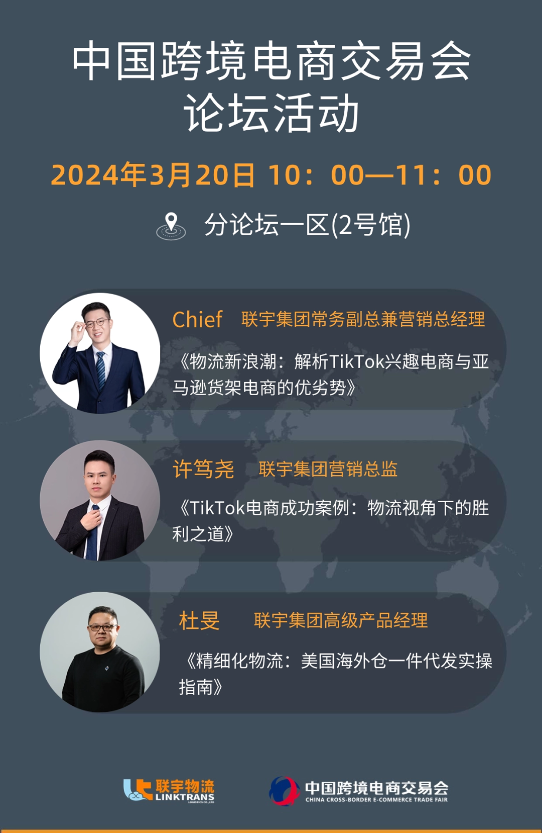联宇集团常务副总兼营销总经理Chief、营销总监许笃尧和高级产品经理杜旻将为与会嘉宾带来跨境电商物流的主题演讲,敬请关注!