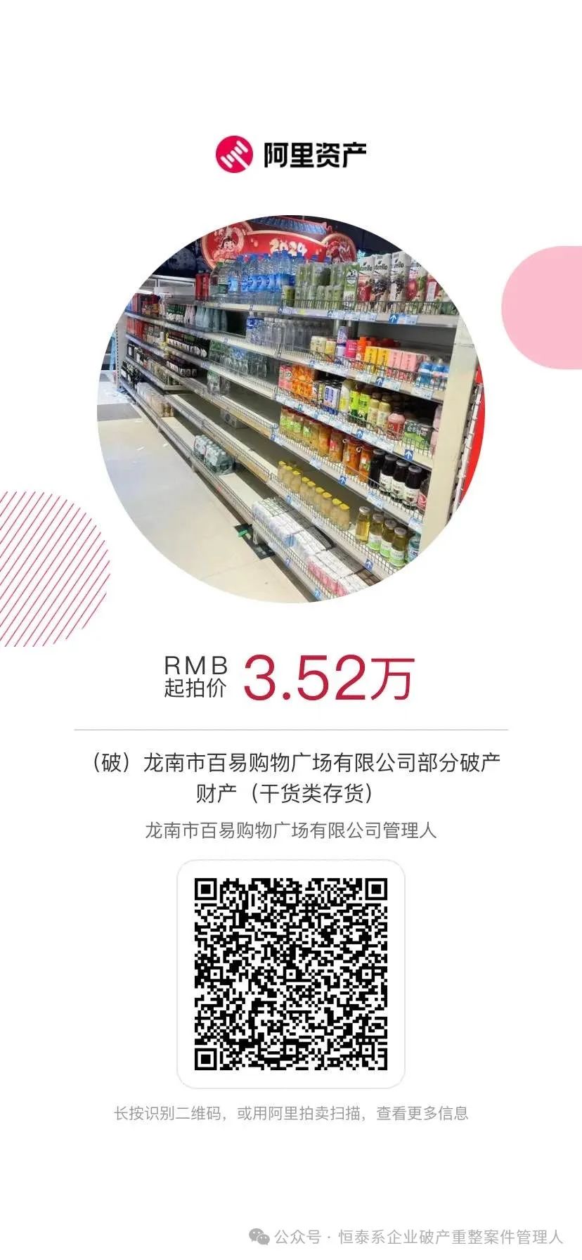 2024年2月16日,江西省龙南市人民法院裁定受理赣州虔酒酒业有限公司、龙南市百易购物广场有限公司破产重整案,管理人接受指定后,发现部分破产财产属于易腐易变质财产,若不及时处置可能造成破产财产贬损。经江西省龙南市人民法院批准,管理人将分别于2024年3月29日10时起至2024年3月30日10时止、2024年3月21日10时起至2024年3月22日10时止在淘宝网阿里拍卖平台处置财产。