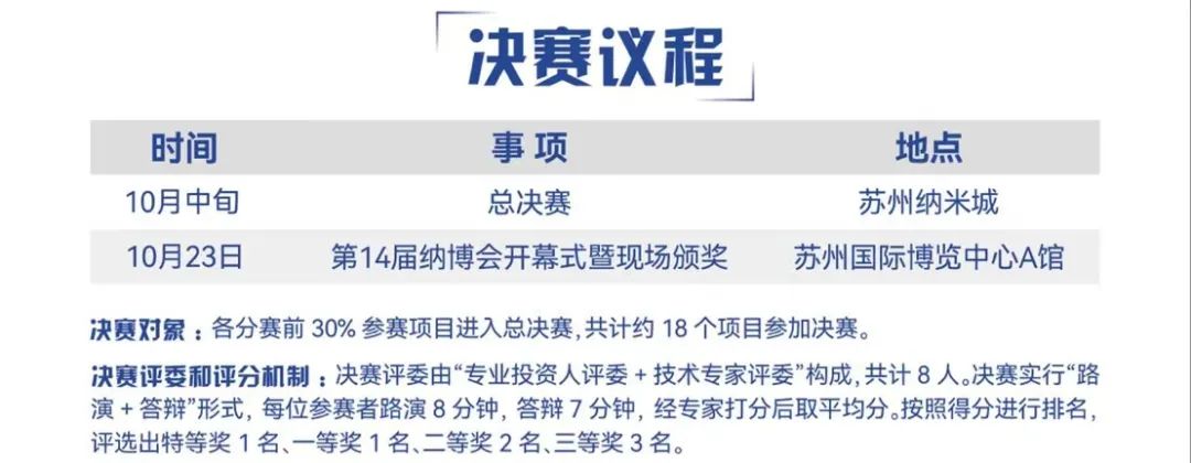 第十四届纳博会创新创业大赛总决赛将于2024年10月中旬举办,总决赛设置特等奖1名、一等奖1名、二等奖2名、三等奖3名,总决赛获评项目将获得现金、纳博会展位和苏州工业园区人才政策等多项奖励。
