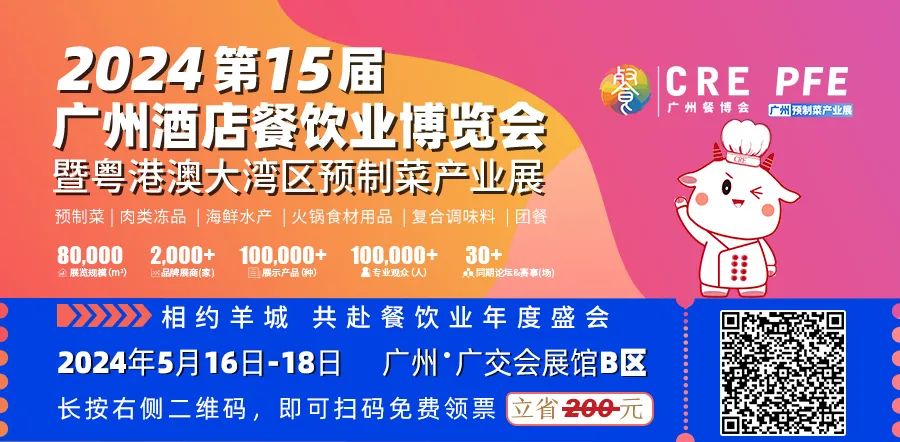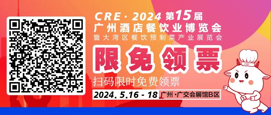 专业观众免费预登记开启,提前预登记免¥200门票,优享专业观众VIP通道快速入场、会议&比赛活动名额等专属服务。2024年5月16日-18日,广州·广交会展馆B区,第15 届CRE广州餐博会欢迎您的莅临!