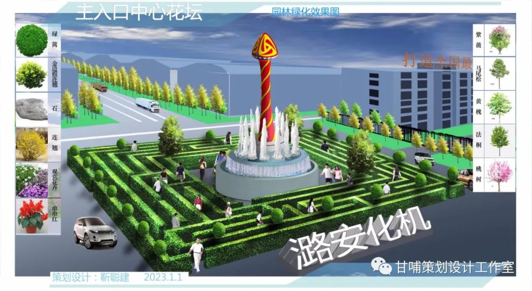 中心花坛由晋华灯塔+喷泉水池+绿篱迷宫组成。