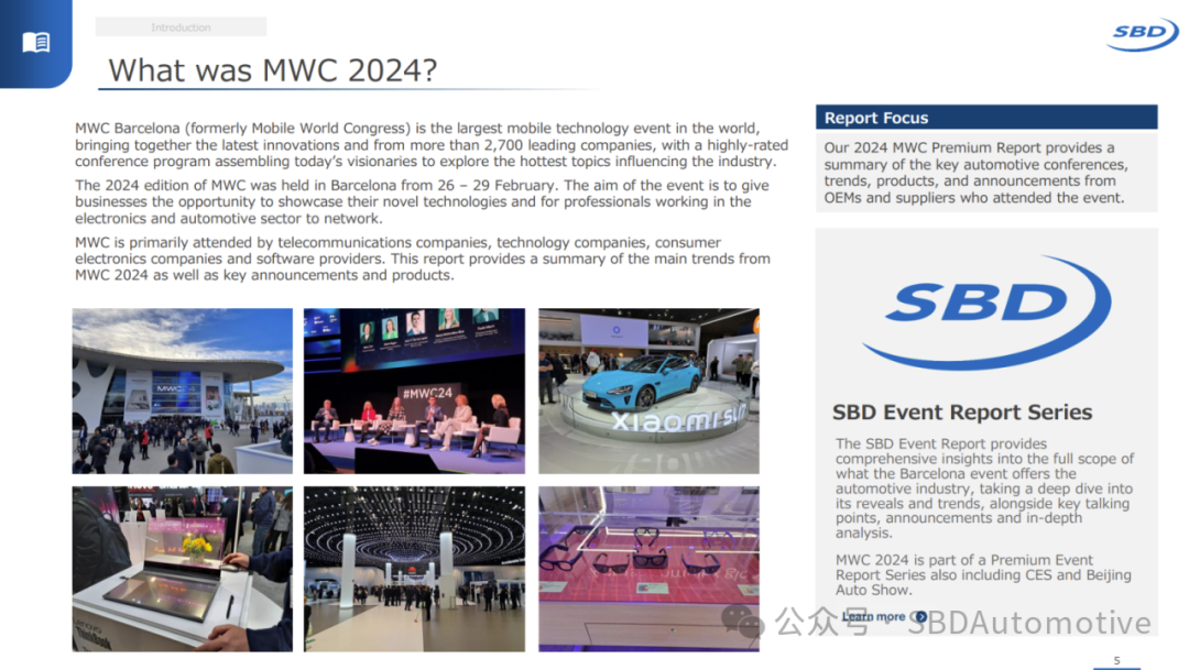 报告全面分析了2024巴塞罗那MWC为汽车行业提供的机会,深入挖掘新技术背后的可能性,揭示市场趋势。SBD活动报告系列在每次重要活动后(如CES、车展、MWC等)提供该活动的全面解析,深入评估本次活动对汽车行业的影响。