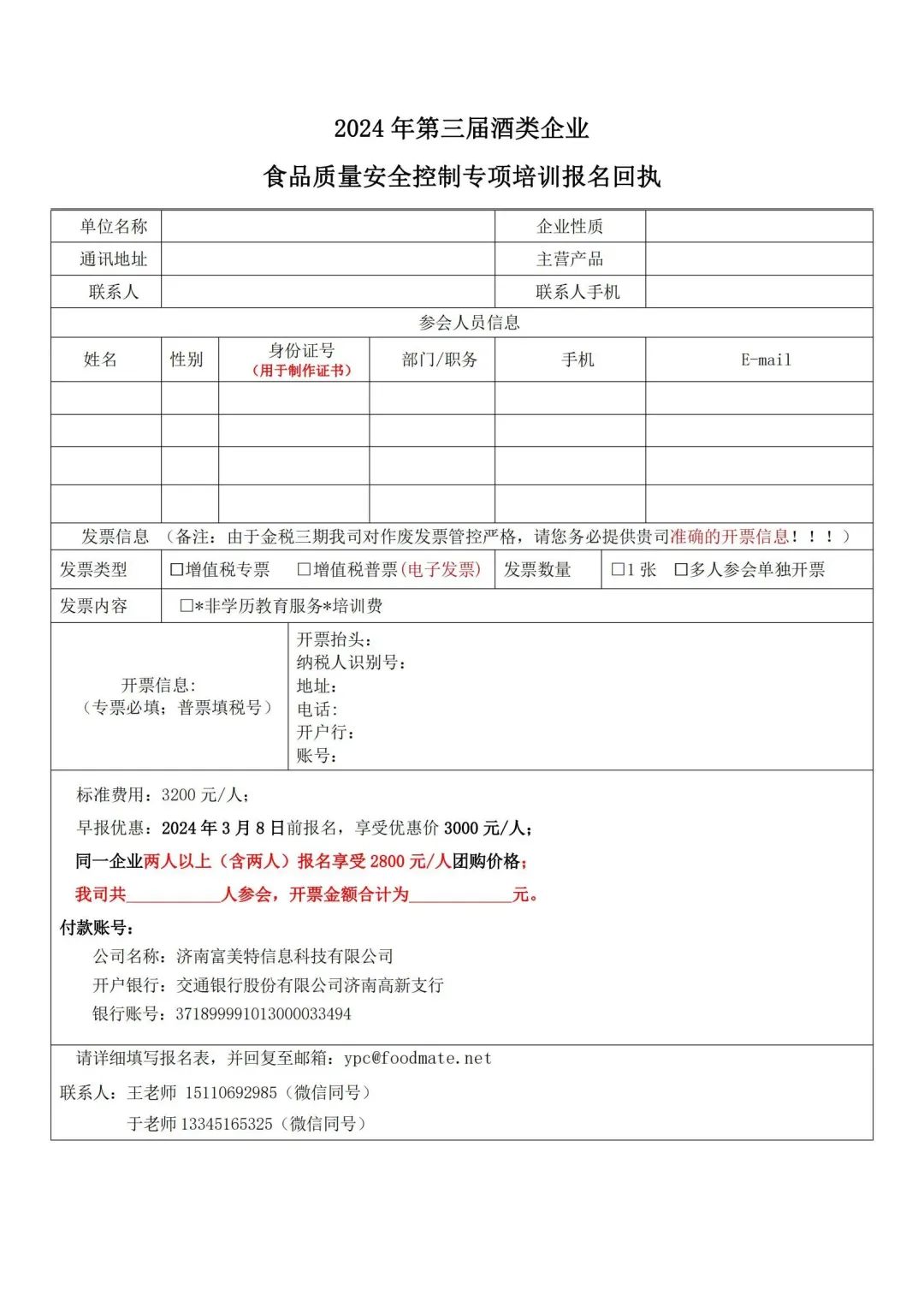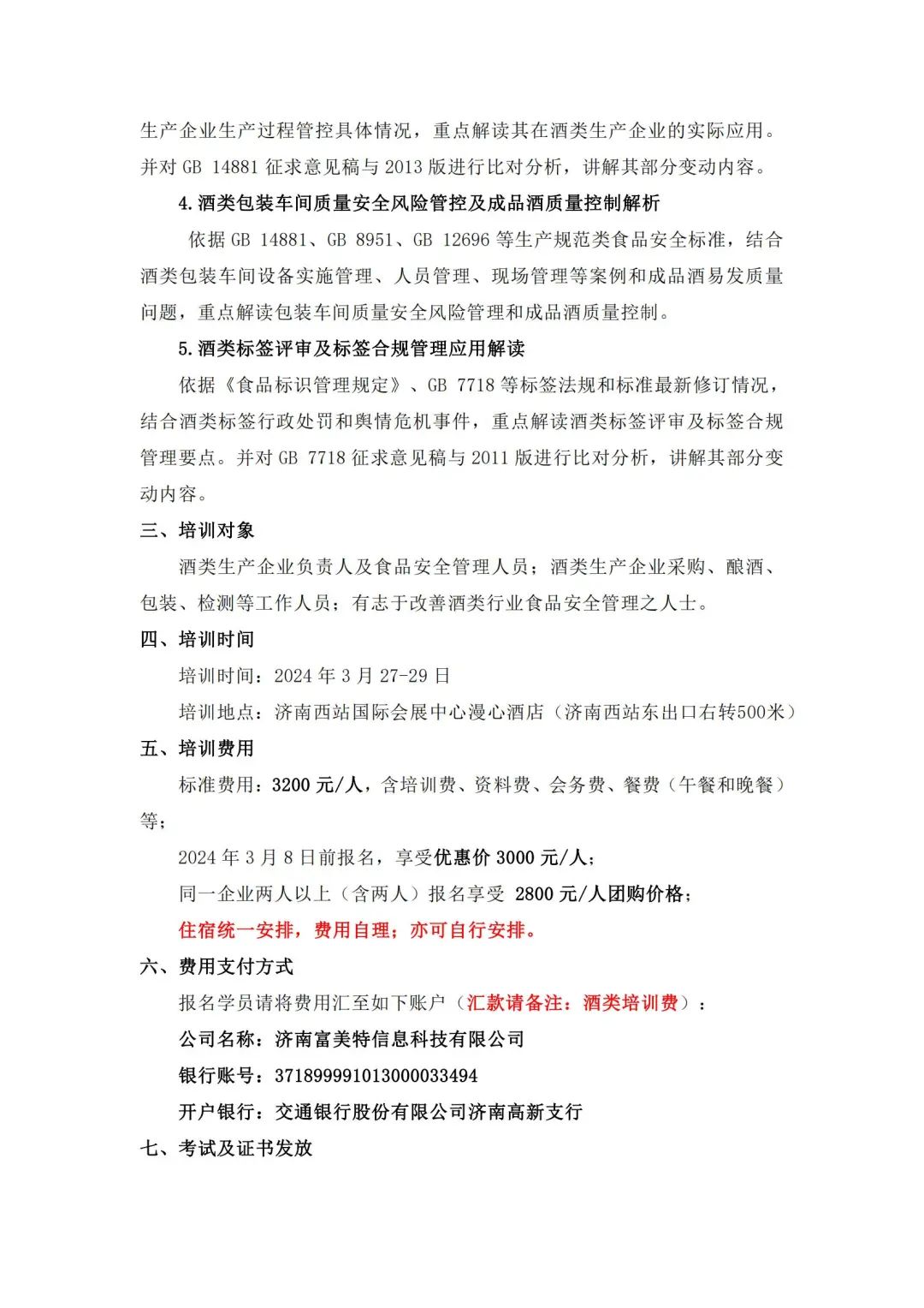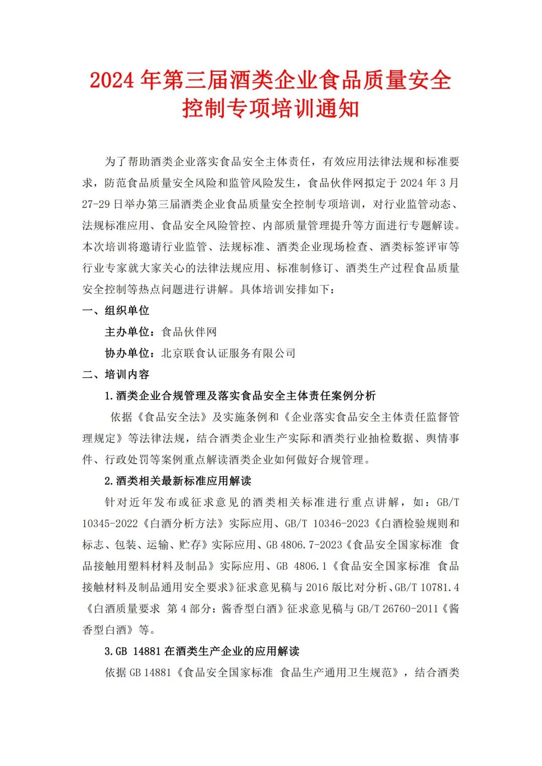 为了帮助酒类企业落实食品安全主体责任,有效应用法律法规和标准要求,防范食品质量安全风险和监管风险发生,食品伙伴网拟定于2024年3月27-29日举办第三届酒类企业食品质量安全控制专项培训,对行业监管动态、法规标准应用、食品安全风险管控、内部质量管理提升等方面进行专题解读。本次培训将邀请行业监管、法规标准、酒类企业现场检查、酒类标签评审等行业专家就大家关心的法律法规应用、标准制修订、酒类生产过程食品质量安全控制等热点问题进行讲解。具体培训安排如下: