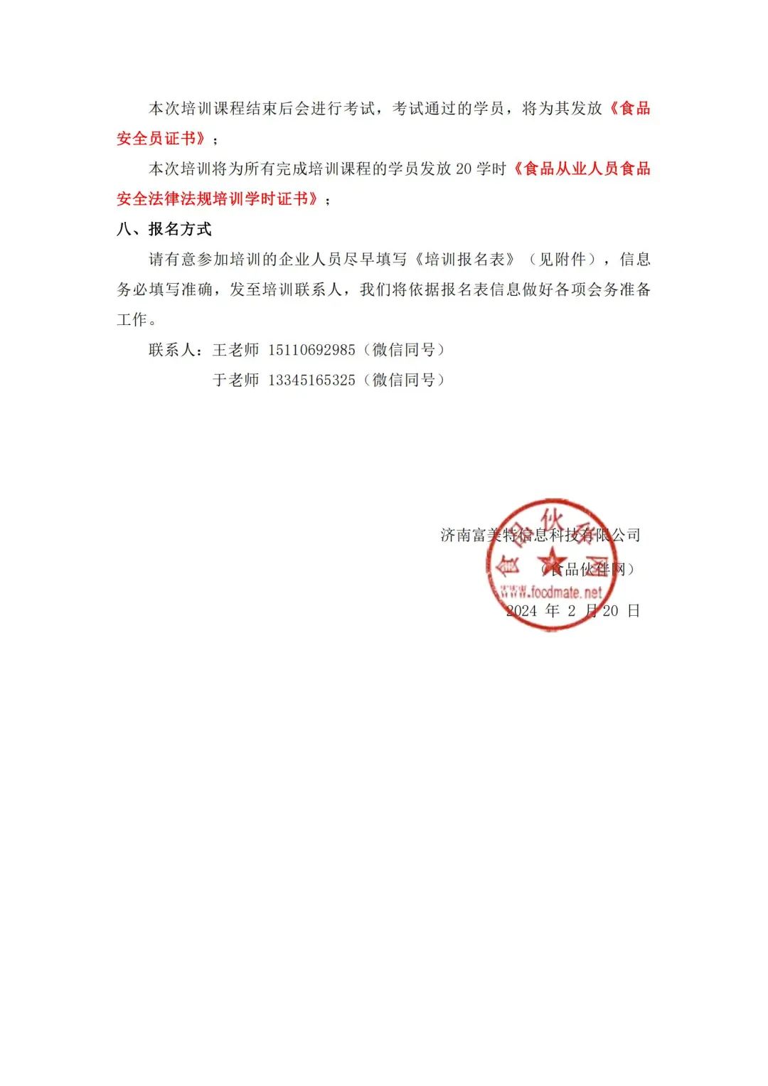 本次培训课程结束后会进行考试,考试通过的学员,将为其发放《食品安全员证书》;