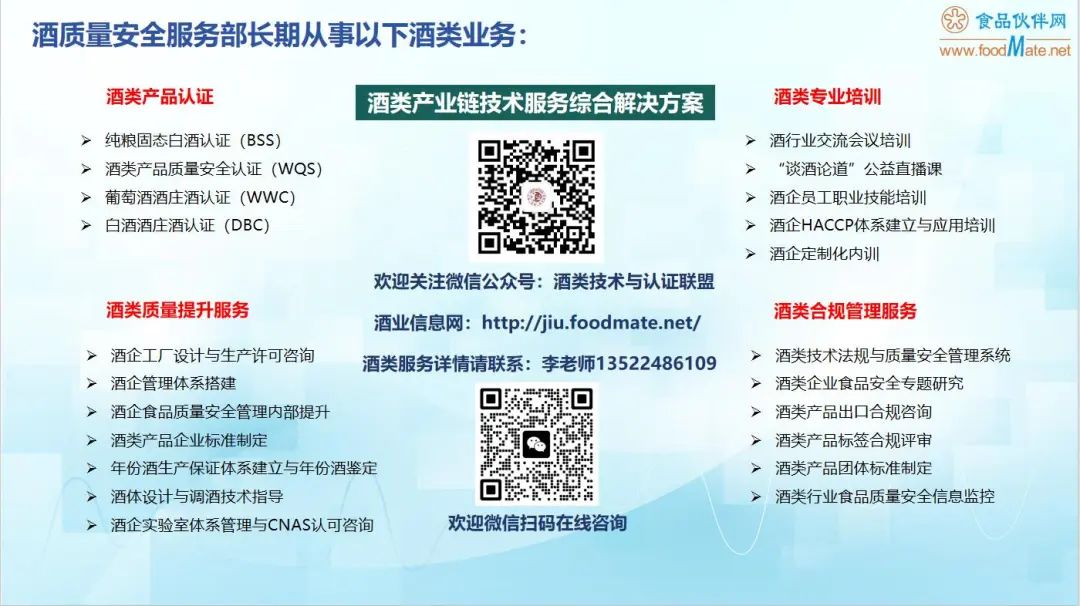 酒质量安全服务部拥有雄厚的行业资源和权威的专业技术资源,依托于食品伙伴网的行业影响力和积累的行业数据,借助互联网信息化技术,整合国家酒类相关最新法律法规和标准变化情况,结合酒类行业实际案例,顺应酒类企业发展需求,为酒类企业提供工厂设计与SC咨询、企业标准和团体标准制修订、酒类法规标准应用培训、酒企员工职业技能提升培训、酒类技术法规及质量安全管理系统应用、酒类食品安全专题研究、酒类产品标签合规评审、酒类产品出口合规咨询、酒类行业食品质量安全信息监控、酒企食品质量安全管理内部提升、酒体设计与调酒技术指导、年份酒生产保证体系建立与年份酒鉴定、酒企实验室管理体系建立与CNAS认可咨询、酒企实验室信息管理系统(LIMS)应用、酒企食品合规管理体系应用与认证、酒企HACCP体系应用与培训、纯粮固态白酒认证、酒庄酒认证、酒类产品质量安全认证等全方位的一站式技术服务综合解决方案。