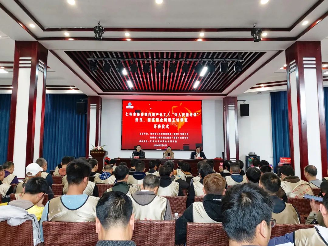 3月13日,由贵州省仁怀市贵良酒业(集团)有限公司和贵州省仁怀市国亮酒业(集团)有限公司主办、仁怀市爽净职业培训学校承办的仁怀市酱香型白酒产业工人“万人技能培训”贵良、国亮酒业制酒工培训班开班仪式在贵良酒业集团举行。参加开班仪式的有贵良酒业(集团)有限公司董事长王岗、爽净职业培训学校校长胡国忠以及70名参训学员。仪式由胡国忠校长主持。