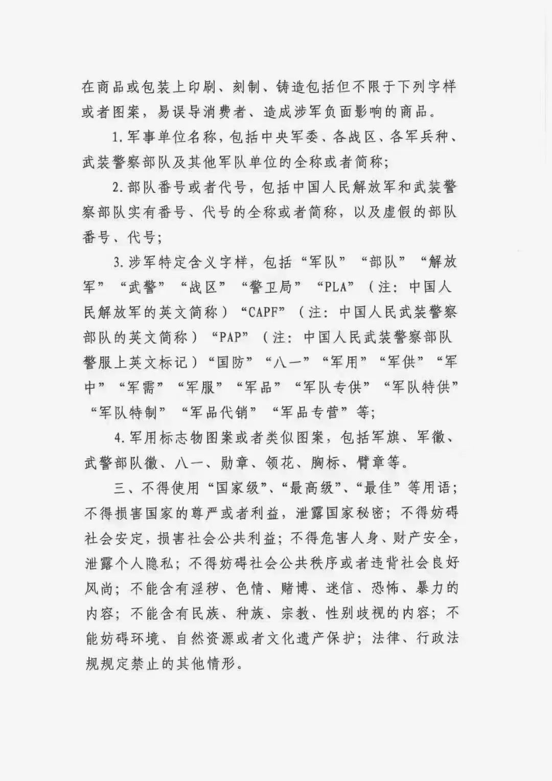 二、严禁线上线下销售“军”字号白酒商品,易误导消费者、造成涉军负面影响的商品。