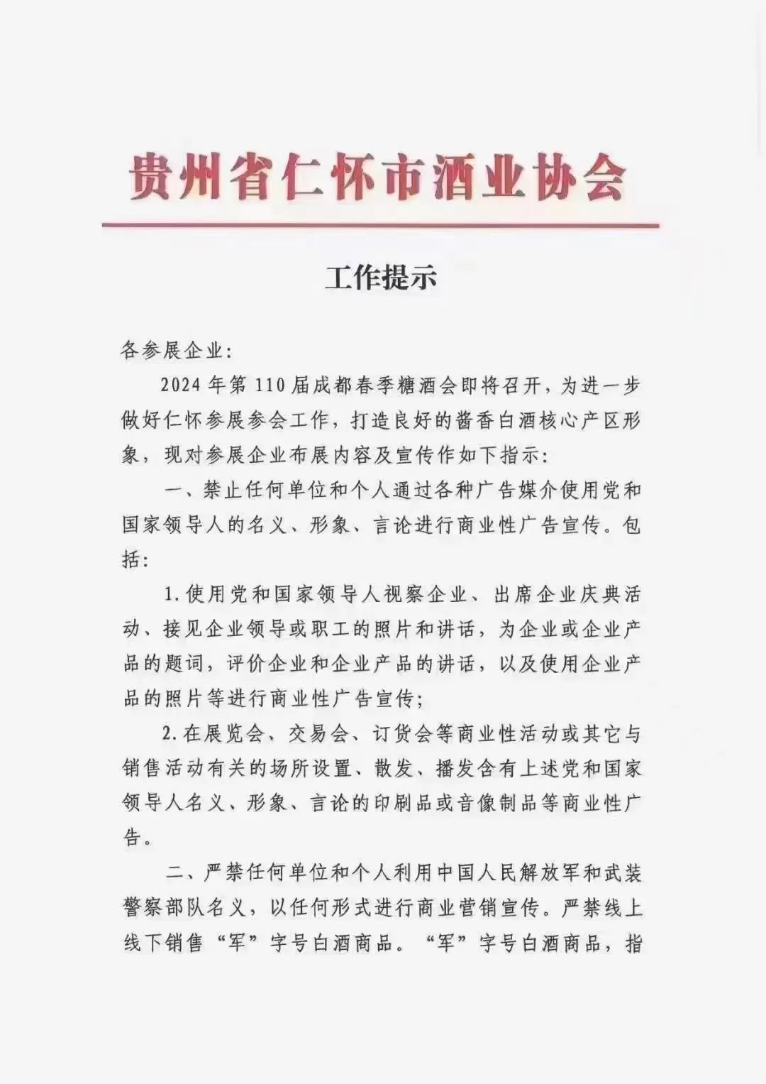 作为参会举足轻重的组成部分,酱酒行业展团参展数量较多。酱酒酒企宣传行为一荣俱荣,一损俱损。为维护酱酒核心产区的良好形象,仁怀市酒业协会现对参展企业布展内容及宣传作如下指示: