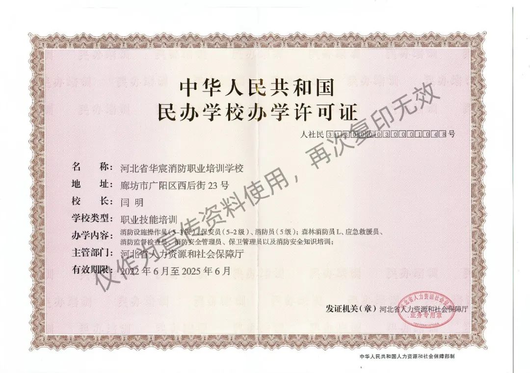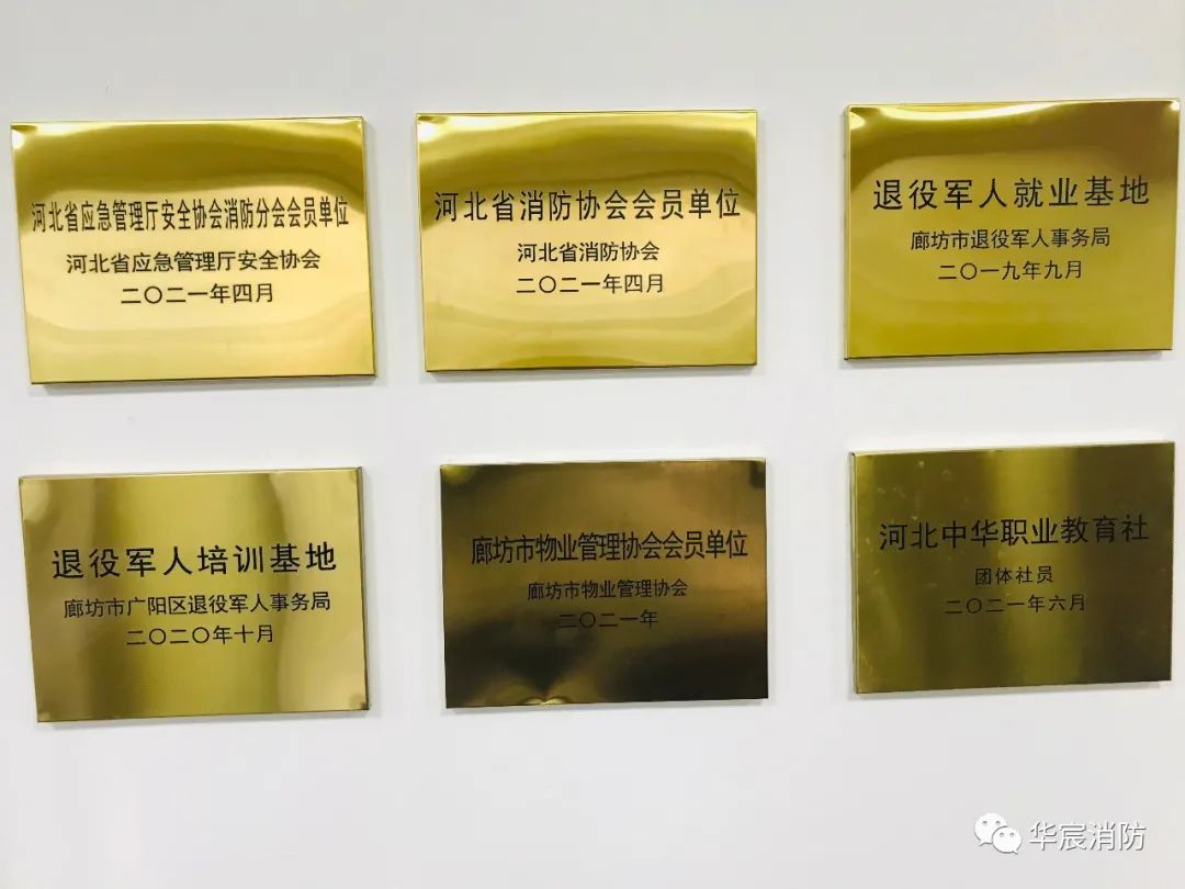 河北省华宸消防职业培训学校是经河北省人力资源和社会保障厅批准,河北省民政厅核准登记,经河北省总队联合审查通过的省级消防职业培训学校;河北省消防协会会员单位、廊坊市退役军人事务局审查通过的退役军人就业基地、广阳区退役军人事务局培训基地、广阳区、固安县、文安县、安次区、永清县人力资源和社会保障局认定的技能培训定点培训机构;由河北中华职业教育社授予我校“团体社员”称号;荣获河北省应急管理与安全生产协会“先进单位”荣誉称号;我校面向全省机关、团体、企业、事业单位开展消防设施工程施工、消防设施检测、维保、安全评估;消防微站建设、消防中控室、消防安保人员委托管理;消防安全岗位资格证书:消防设施操作员(5-3级)培训;消防安全知识培训;消防安全管理员培训;森林消防员L;灭火救援员初级培训;应急救援员培训;应急安全岗位资格证书:一般行业负责人安全培训;高危企业安全管理人员培训;高低压电工作业;高处作业;焊工;其它培训:保安员资格证书培训;企事业单位员工消防安全培训;社会科普培训;行业协会、集团企业消防安全责任人培训;注册消防工程师培训;