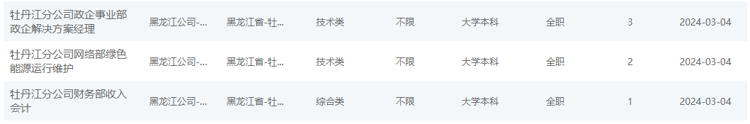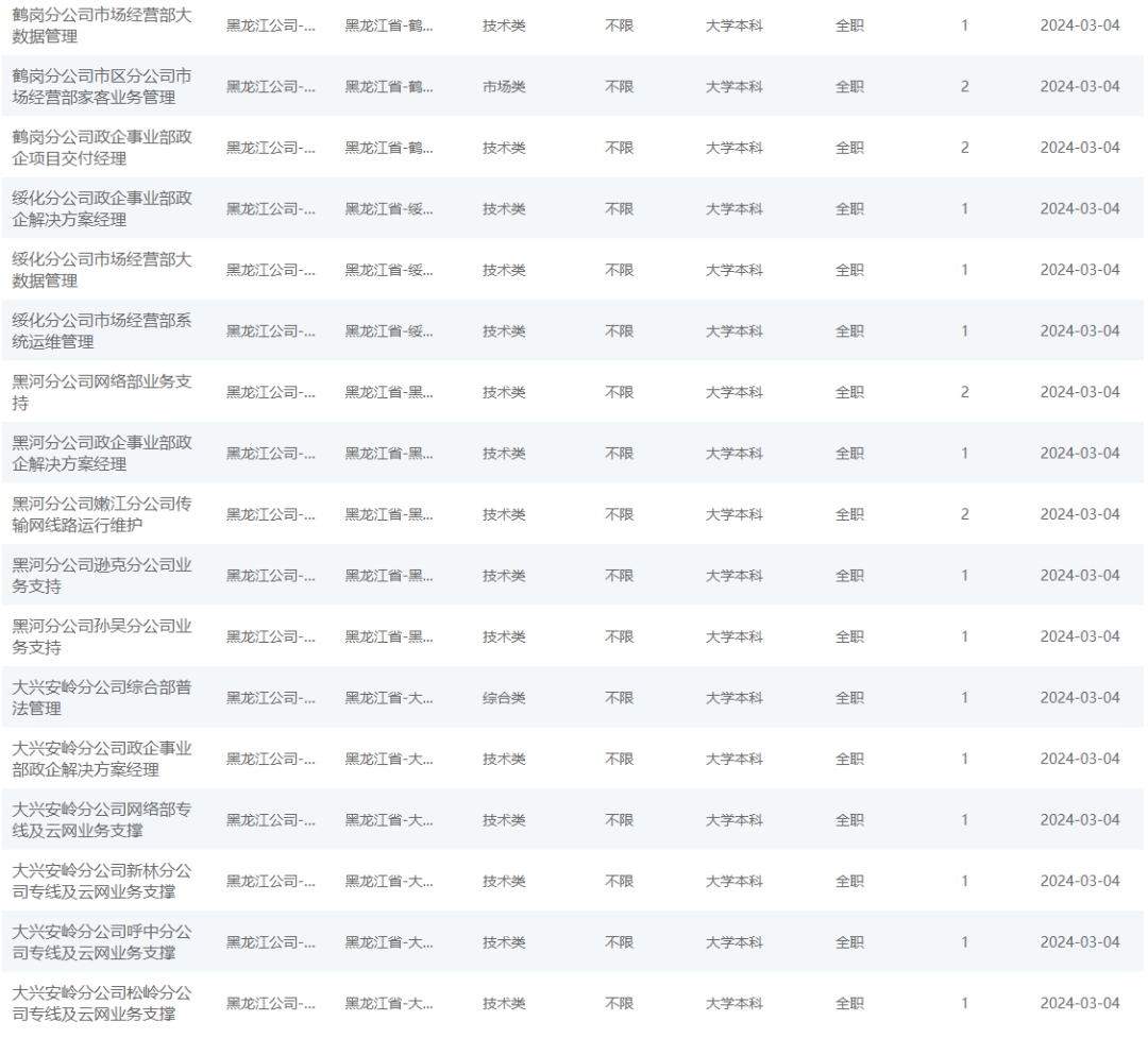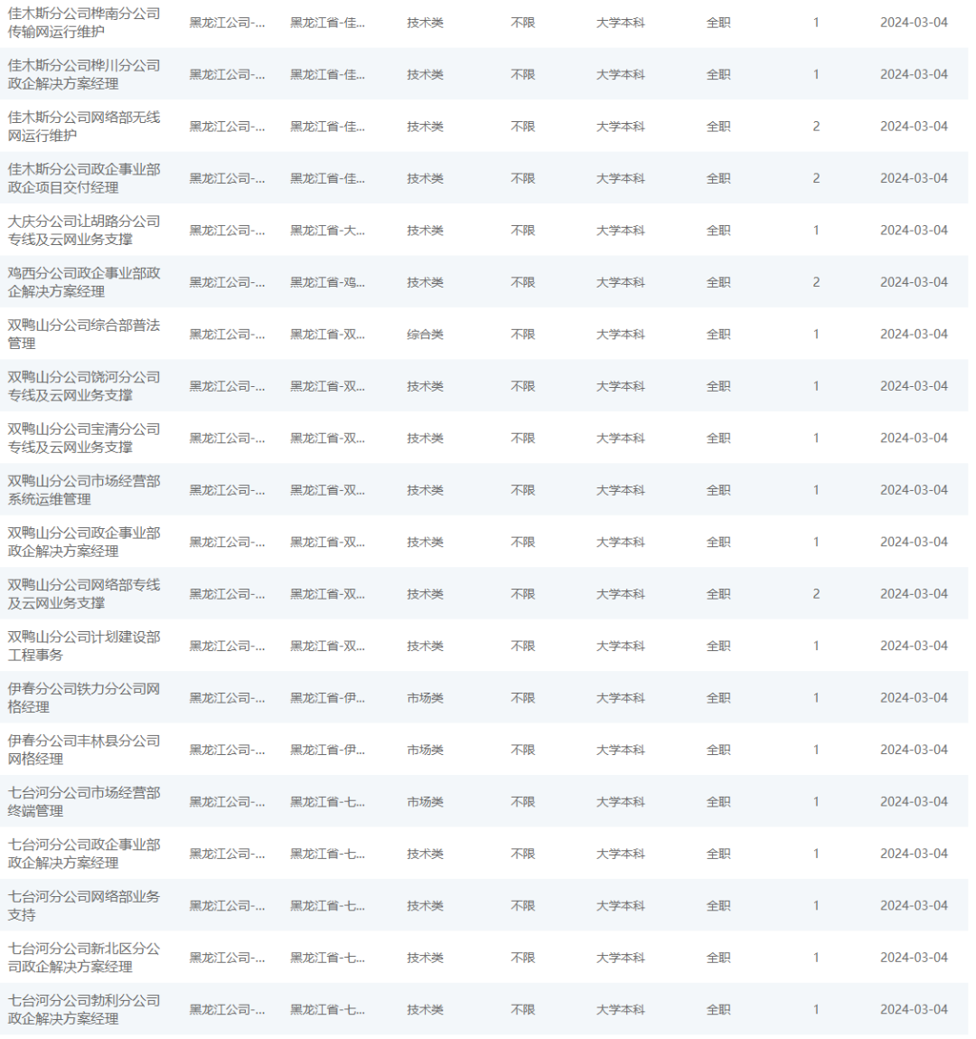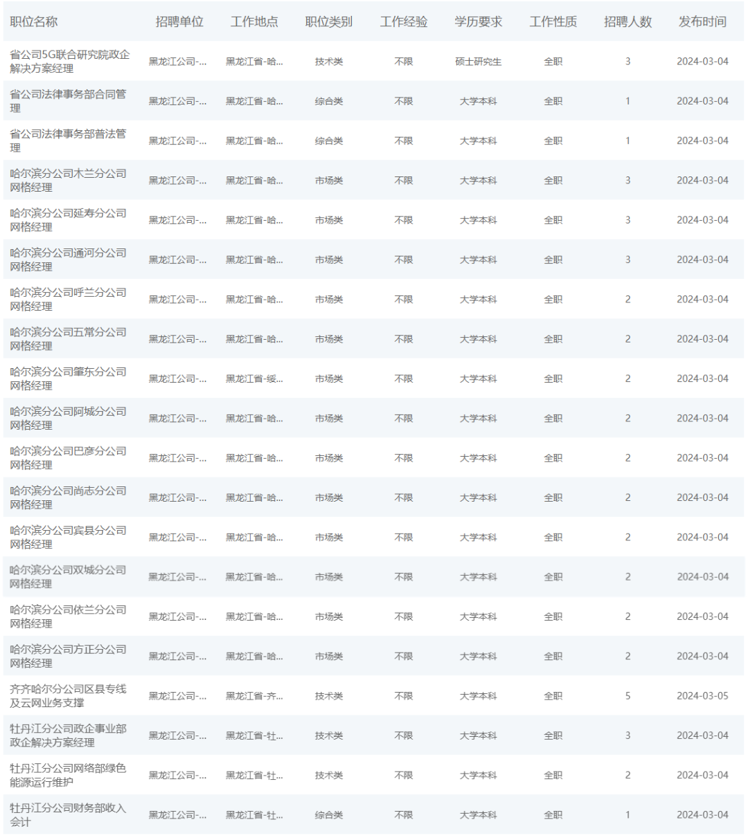 中国移动黑龙江公司是中国移动有限公司的全资子公司,公司下设23个部门、下辖13个地市分公司、117个区县分公司,现有员工1.05万左右。是全省客户规模、网络规模最大的通信运营企业。中国移动黑龙江公司持续进行更利于员工成长、员工晋升、员工流动的管理体系改革。除提供您基本养老保险、基本医疗保险、生育保险、工伤保险、失业保险、住房公积金外,还享受企业补充医疗保险、企业年金等其他福利,使员工全身心投入工作,无后顾之忧。公司勇于承担“网络强国、数字中国、智慧社会”主力军,推进新基建、融合新要素、激发新动能,网络无所不达、算力无所不在、智能无所不及。广阔平台,寻梦起航!招聘岗位