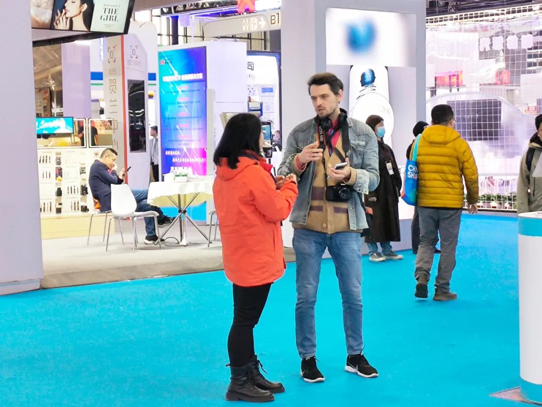 今天的超赢科技展位除了有国内客商,还吸引了不少海外客商。为了方便交流,展位上安排了两位外贸销售同事进行接待,给海外客商提供优质便利的服务。