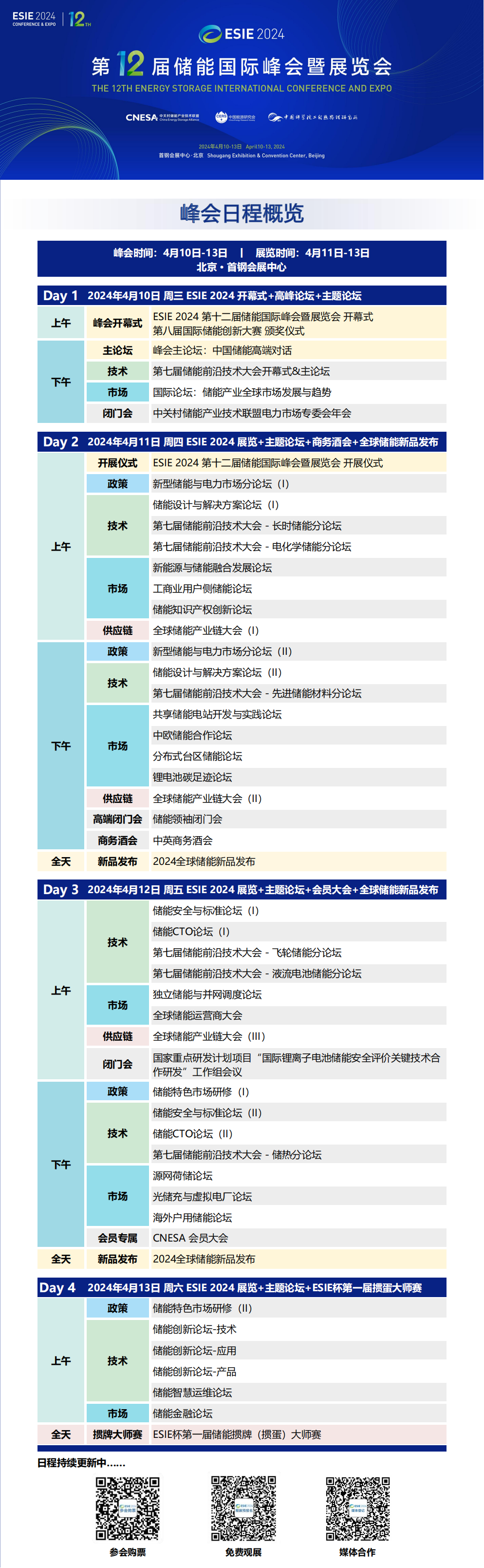由中关村储能产业技术联盟、中国能源研究会、中国科学院工程热物理研究所主办的第12届储能国际峰会暨展览会(ESIE 2024)定档于2024年4月10日-13日,在北京首钢会展中心盛大开幕。本届峰会主题为“发展储能新质生产力,开创能源转型新格局”。
