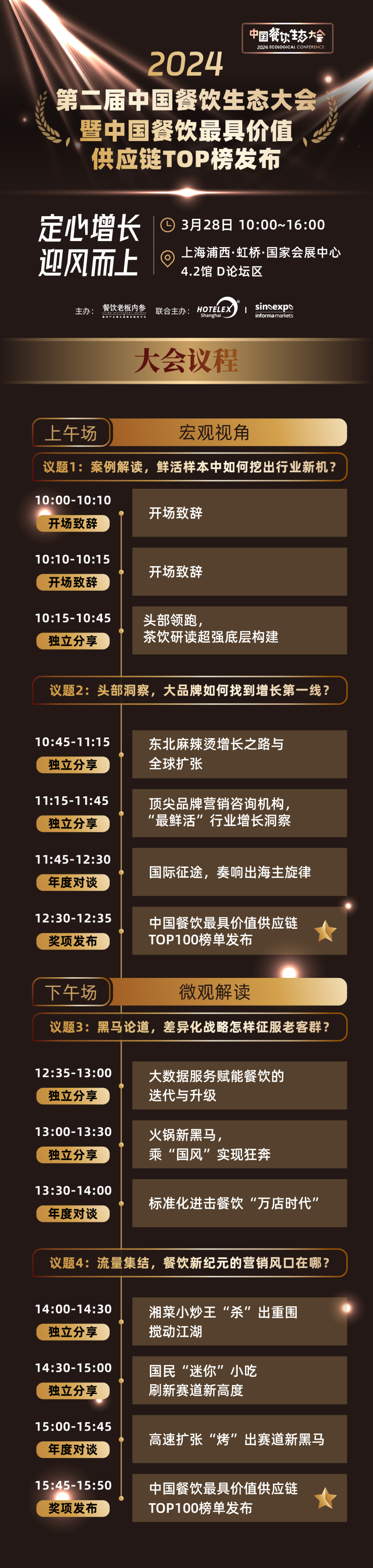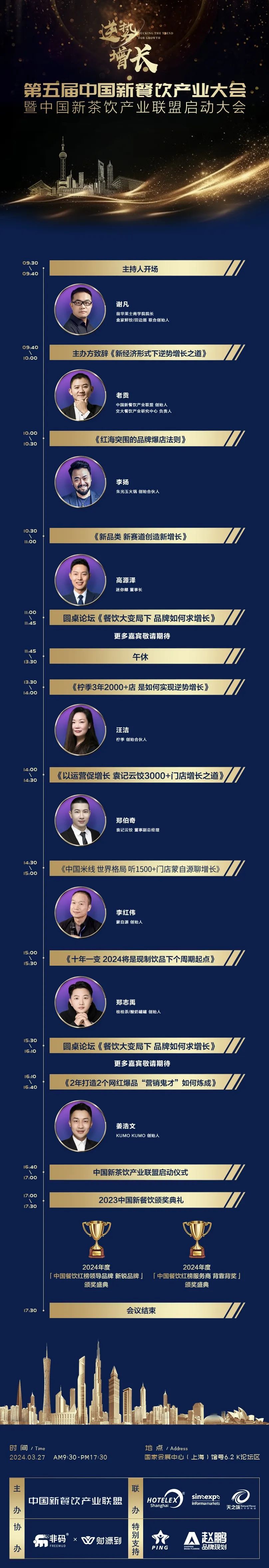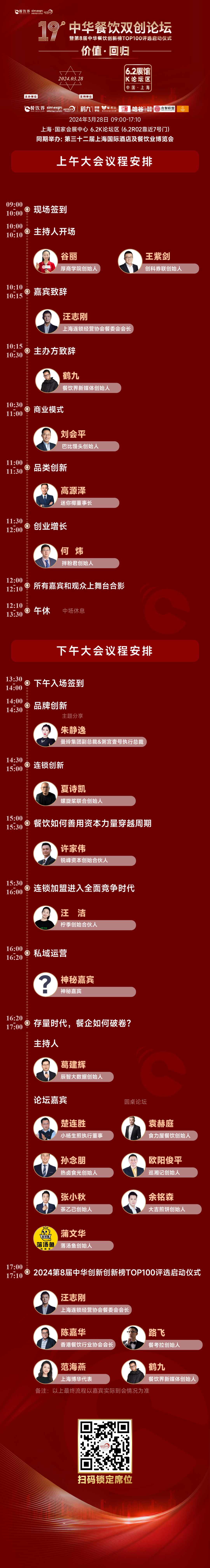 面对这样的市场格局,如何在2024年餐饮品牌实现逆境增长,如何从头部品牌的发展经验中学习增长内在动力?为此,我们特地邀请了30多位头部品牌嘉宾亲临现场,为大家一一揭示他们增长的奥秘。