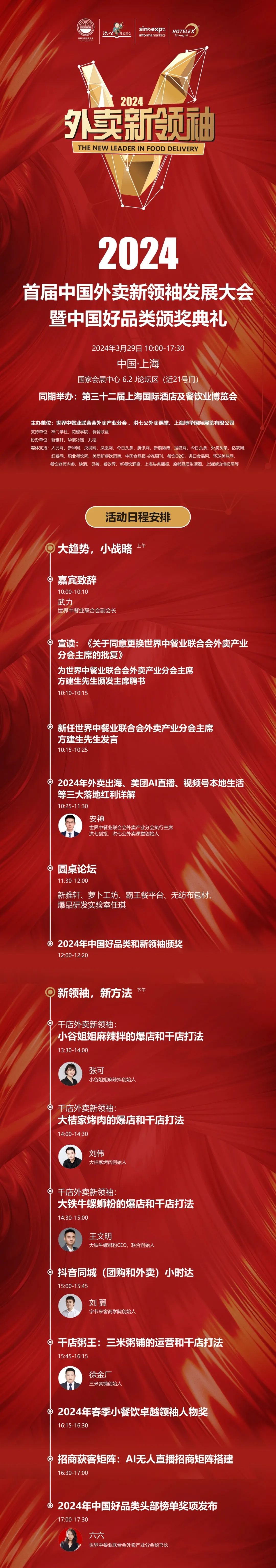为深入贯彻党中央、国务院关于恢复和扩大消费相关决策部署,落实中央经济工作会议部署,大力发展数字消费、绿色消费、健康消费。为加快构建餐饮企业产销融合对接机制,秉承“以外卖为中心,创造价值”的理念,保障消费者的合法权益,促进网络餐饮平台和外卖产业健康可持续发展。世界中餐业联合会定于2024年3月29日在上海举办“外卖新领袖”2024首届中国外卖新领袖发展大会暨中国好品类颁奖典礼。
