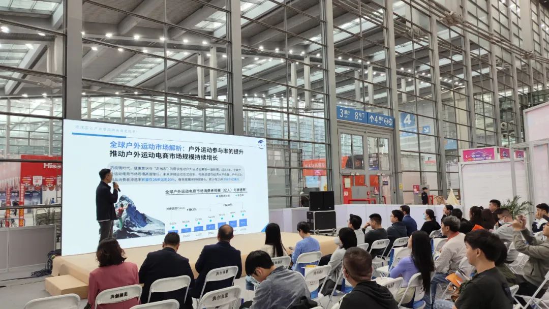 上午10点30后进入主旨演讲环节,跨津荟市场VP盛庆铭介绍了跨津荟的业务战略,并结合行业报告深入分析了户外运动品类的海外市场需求,他认为做好产品数据分析是产业带商家转型跨境电商的关键。