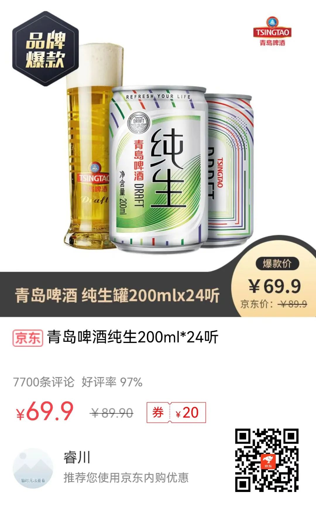 青岛啤酒纯生200ml*24听