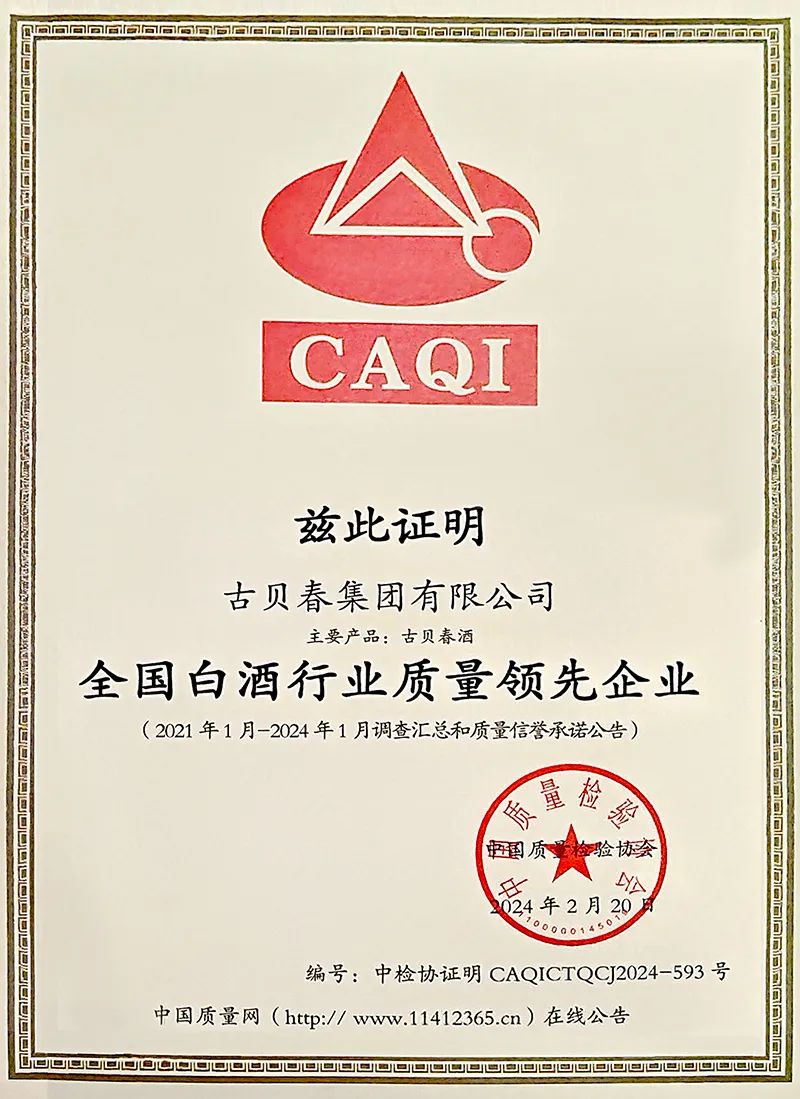 在“3·15国际消费者权益日”之际,“质量”又成为社会各界及广大消费者高度关注的焦点。近日,在中国质量检验协会举办的 2024 年“3.15”国际消费者权益日“产品和服务质量诚信承诺”主题活动中,古贝春集团凭借过硬的产品品质和诚信经营的服务理念,再度荣获“全国白酒行业质量领先企业”、“全国产品和服务质量诚信品牌”和“全国质量检验稳定合格产品”三项荣誉认证,这是对古贝春集团长期以来坚持质量第一、诚信为本的高度肯定。