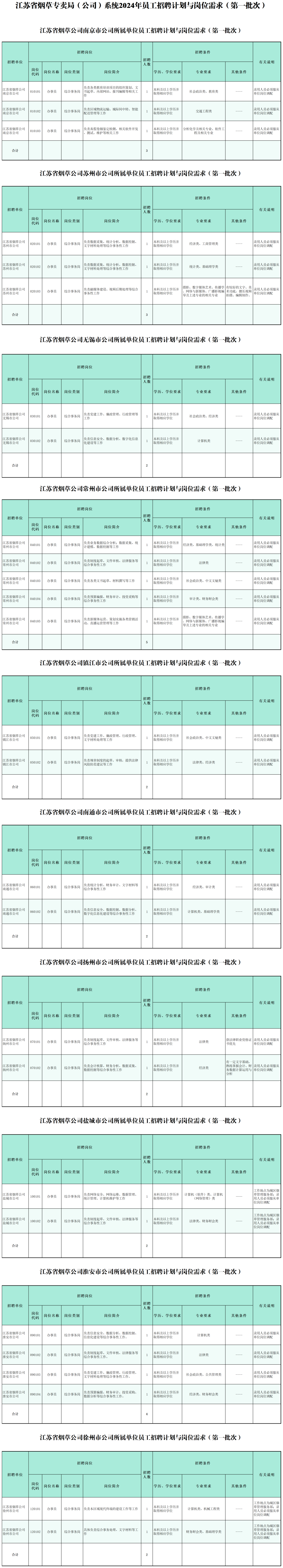 附件1:江苏省烟草专卖局(公司)系统2024年员工招聘计划与岗位需求(第一批次)