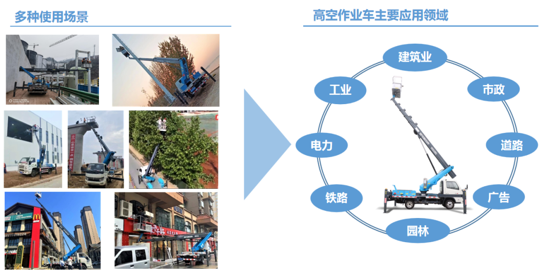 高空作业车汽车底盘可快速移动,机动性强、场地适应性强,可水平跨越等优点,目前主要应用于建筑业、市政、园林、电力、工业等施工领域,如桥梁检修、厂房维护、老旧小区改造、广告安装工程等。
