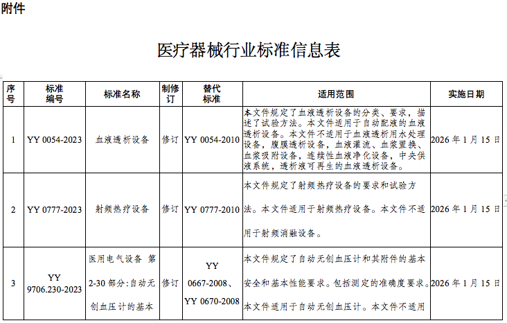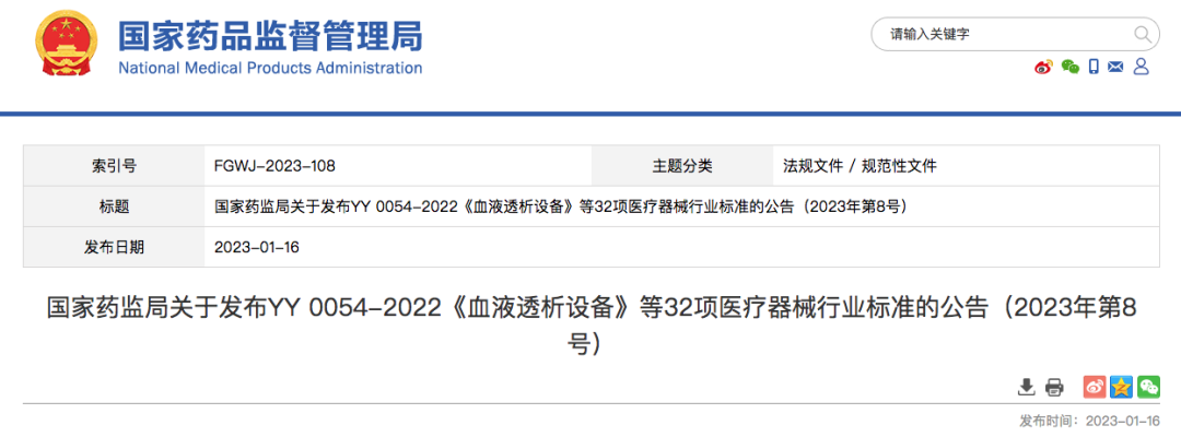 Y 0054-2022《血液透析设备》等32项医疗器械行业标准已经审定通过,现予以公布。标准编号、名称、适用范围和实施日期见附件。