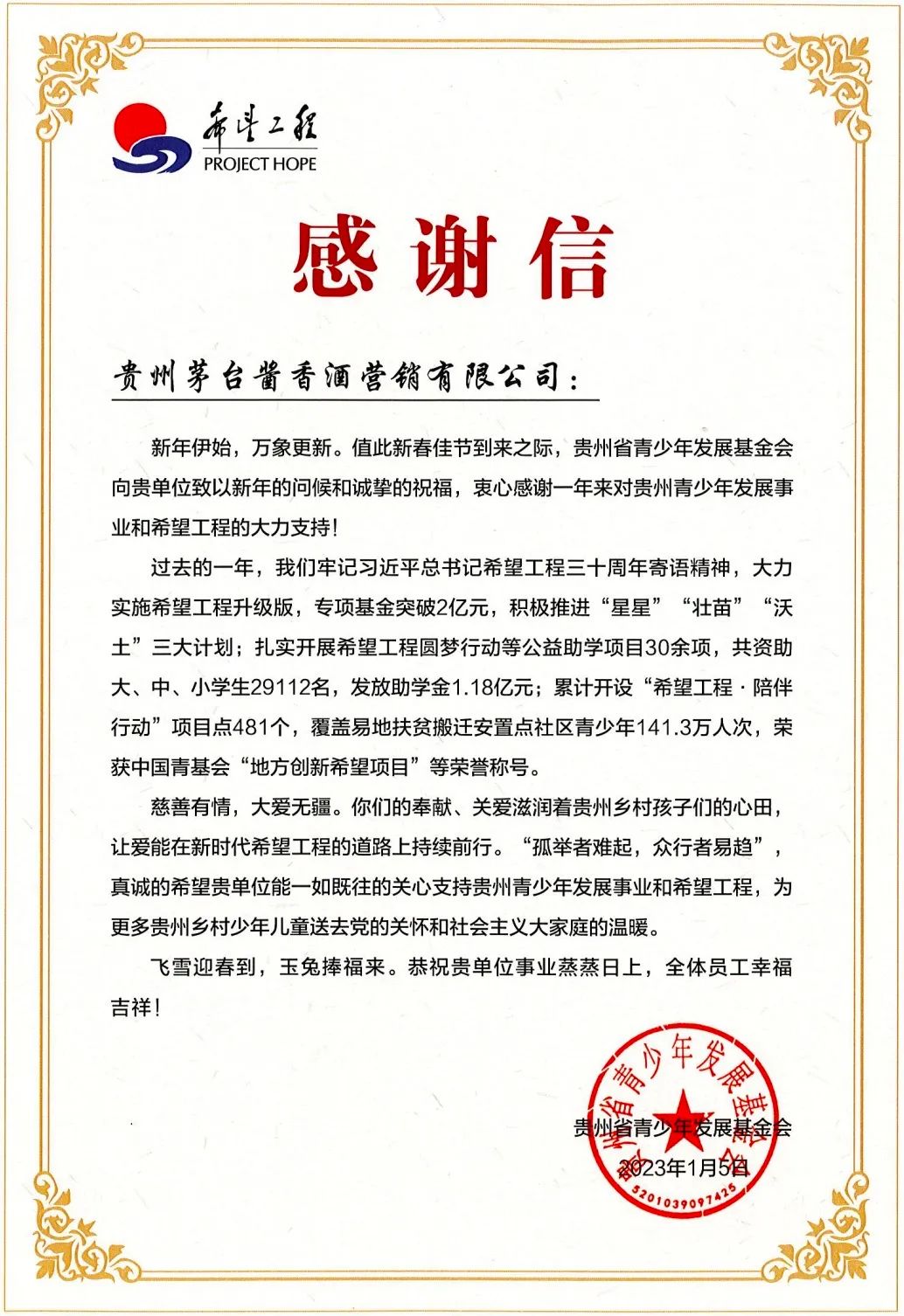 信中写道,一年来,贵州希望工程升级版,专项基金突破2亿元,积极推进了“星星”“壮苗”“希望工程·陪伴行动”等多个项目。贵州省青少年发展基金会衷心感谢贵州茅台酱香酒营销有限公司一年来对贵州青少年发展事业和希望工程的大力支持!