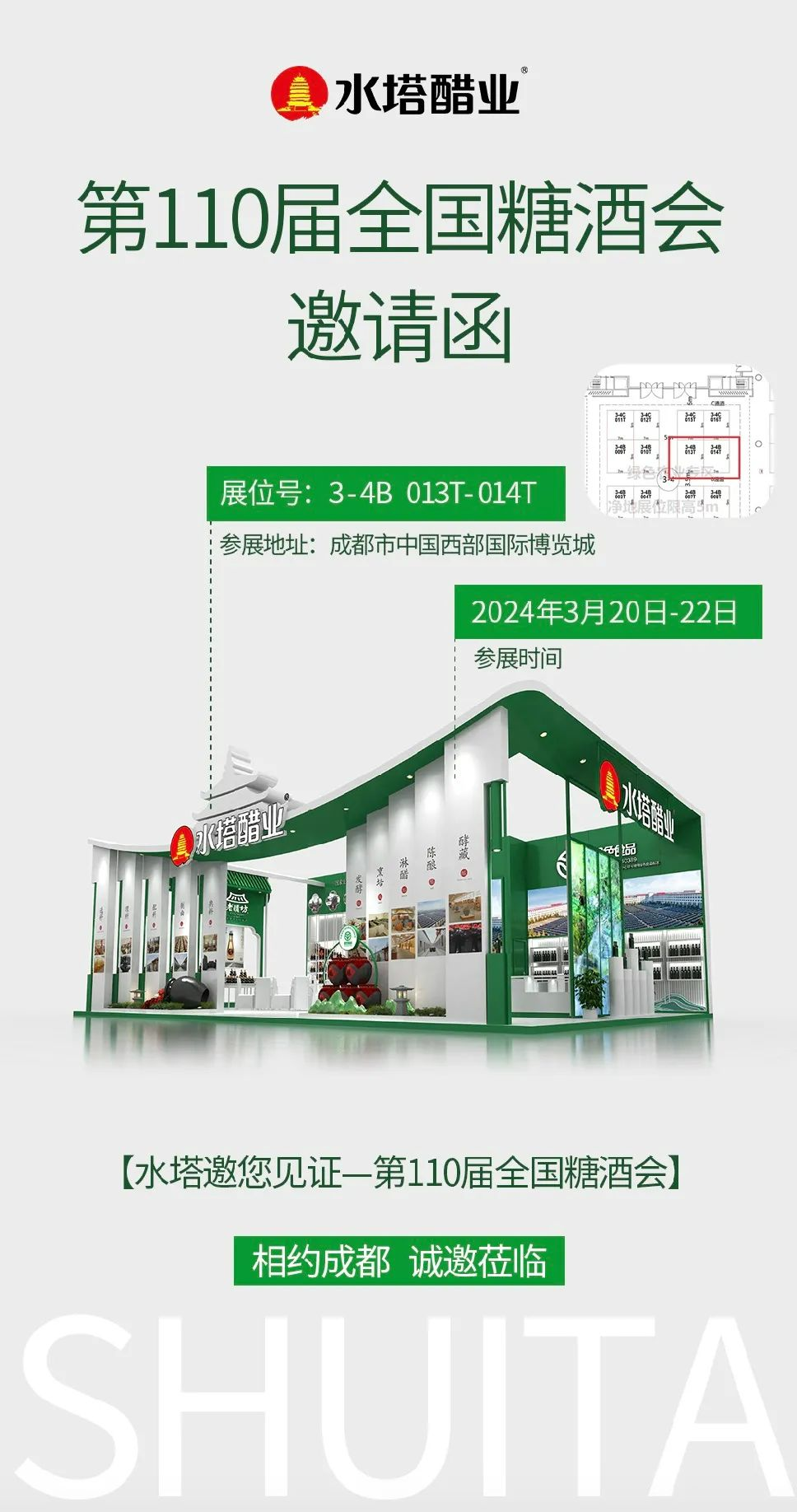 2024年3月15日--3月22日,第110届全国糖酒商品交易会在四川成都举办。水塔醋业受邀参展,在中国西部国际博览城3-4连接馆3-4B013T、 3-4B014T展位向全国各地的客商展示山西老陈醋的文化魅力和卓越品质。