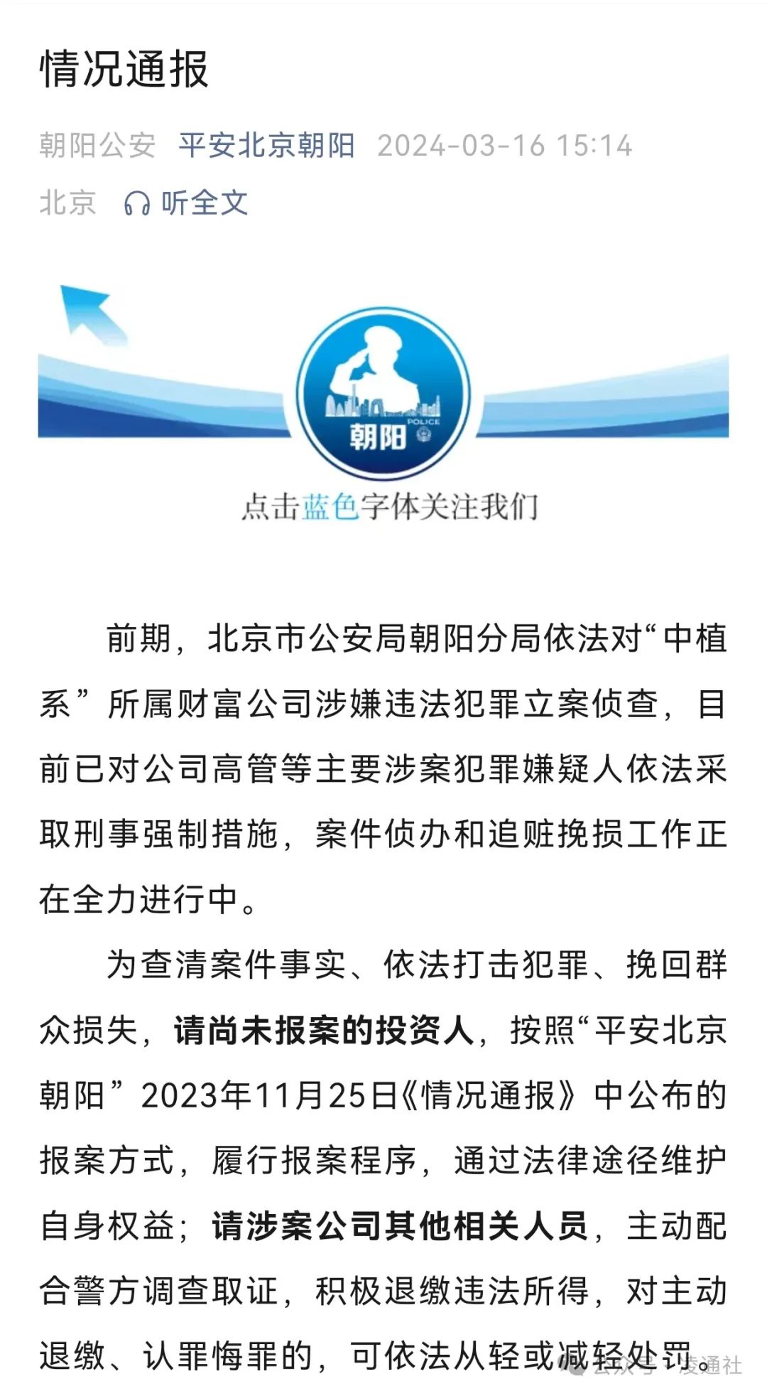 前期,北京市公安局朝阳分局依法对“中植系”所属财富公司涉嫌违法犯罪立案侦查,目前已对公司高管等主要涉案犯罪嫌疑人依法采取刑事强制措施,案件侦办和追赃挽损工作正在全力进行中。