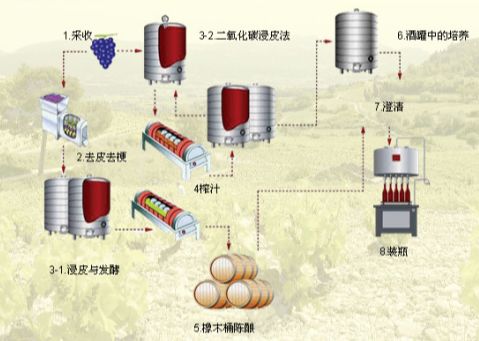 经去梗和破碎的葡萄发酵葡萄经过去梗和破碎之后,便会转移至发酵罐中。发酵容器可以是不锈钢罐、水泥罐或是橡木桶,且一般容量较大,顶部为敞口设计,便于酿酒师在发酵过程中对酒帽进行控制。酒帽指的是发酵过程中浮在酒液表面上的一层厚厚的果肉与果皮,如果不对酒帽进行控制,任由其自然发展,那么下层酒液与它的接触就会比较有限,不利于充分萃取颜色、香味物质和单宁,因此发酵过程中,控制酒帽极为重要。顾名思义,即将酒帽按压至酒液中。传统上,该方法由人工采用带桨的棍子将酒帽按压下去,但操作过程中,发酵罐上方的二氧化碳浓度较高,会对工人造成一定危害。如今,机械桨也能达到同样的效果,已被广泛应用。利用泵将发酵中的葡萄汁从发酵罐底部抽至顶部往下淋,将酒帽淋透。将发酵中的葡萄汁排出至另一个发酵容器中,仅剩下酒帽,再将葡萄汁泵回至酒帽上。
