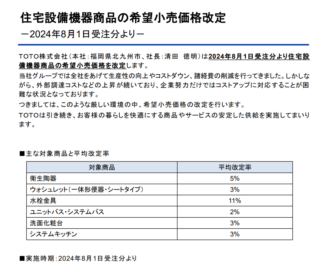 近日,TOTO公布新一轮涨价措施,将从2024年8月1日起调整其卫浴产品的建议零售价。