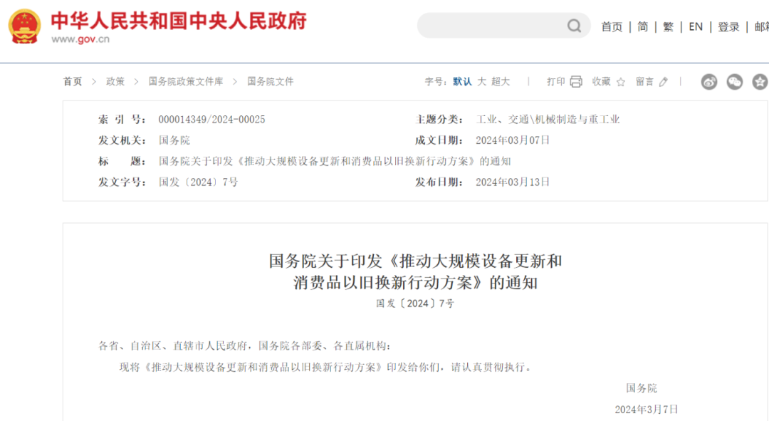 近日,国务院印发《推动大规模设备更新和消费品以旧换新行动方案》。