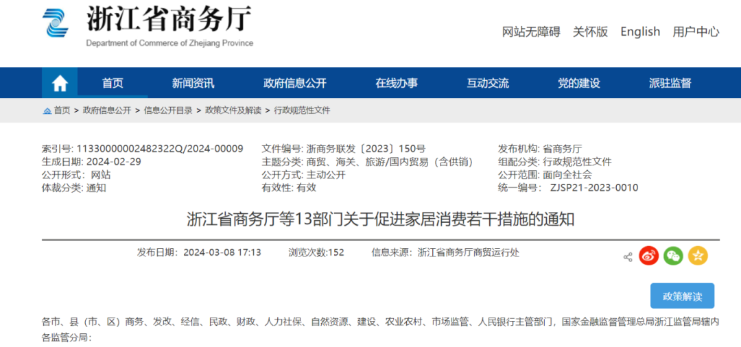 3月8日,浙江省商务厅发布通知表示,为进一步释放家居消费潜力,促进家居消费提质升级,浙江省商务厅等13部门研究制定了《促进家居消费若干措施》。