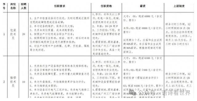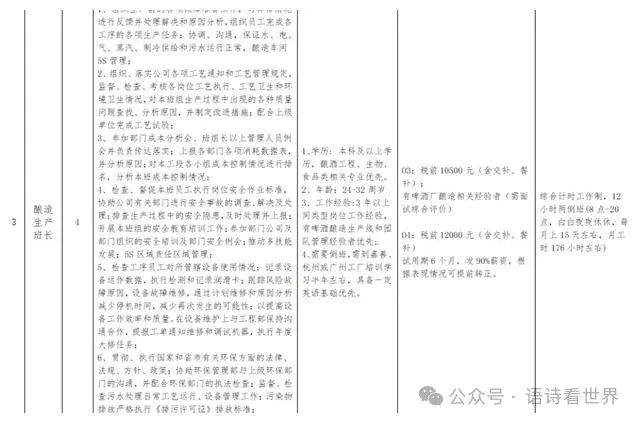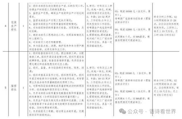 首先,让我们来详细介绍一下本次招聘的岗位和要求。我们需要招聘的岗位包括包装技术员、维修技术员、酿造生产班长、包装生产班长和维修班长。每个岗位都承载着公司运营的重要责任,需要不同的技能和素养来胜任。