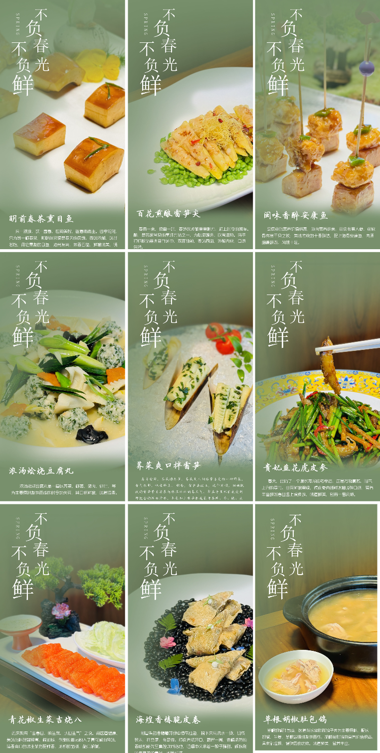云淡出春色,“艳”遇正当时,生机盎然的春季,万物复苏。将传统结合时尚的料理方式,讲述春天最健康的味道。酒店推出了九款春季菜品,让我们趁着春风来一次美食的“踏春”之旅吧!