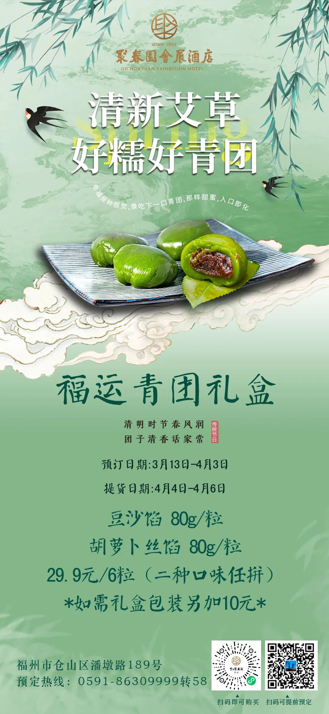 此值清明之际,酒店推出多种口味福运青团礼盒,传统与创新的融合,鲜嫩的艾草清香飘荡,Q弹软糯,独有的鲜,包裹其中,欢迎提前预订!