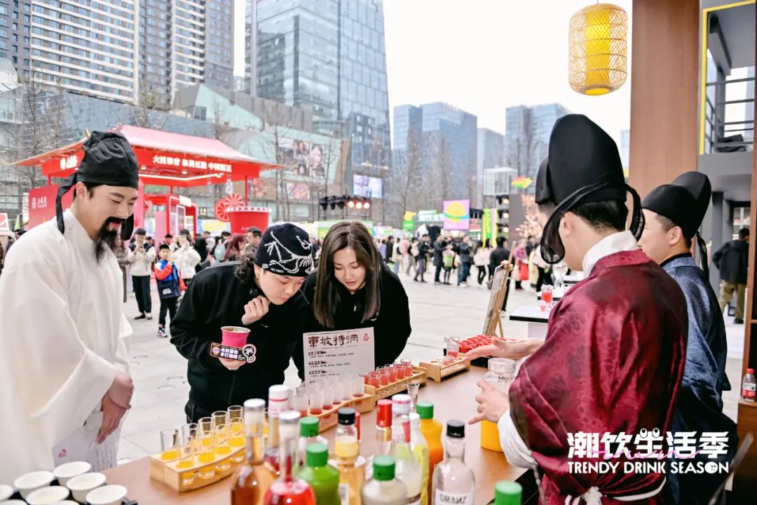 现场特别设置了“东坡小酒馆”,展馆分为宋词展示区、国风调酒区及特色互动区。在特色互动区,“苏东坡先生”和现场观众玩起了飞花令,并为答对的玩家送上一杯免费特调。