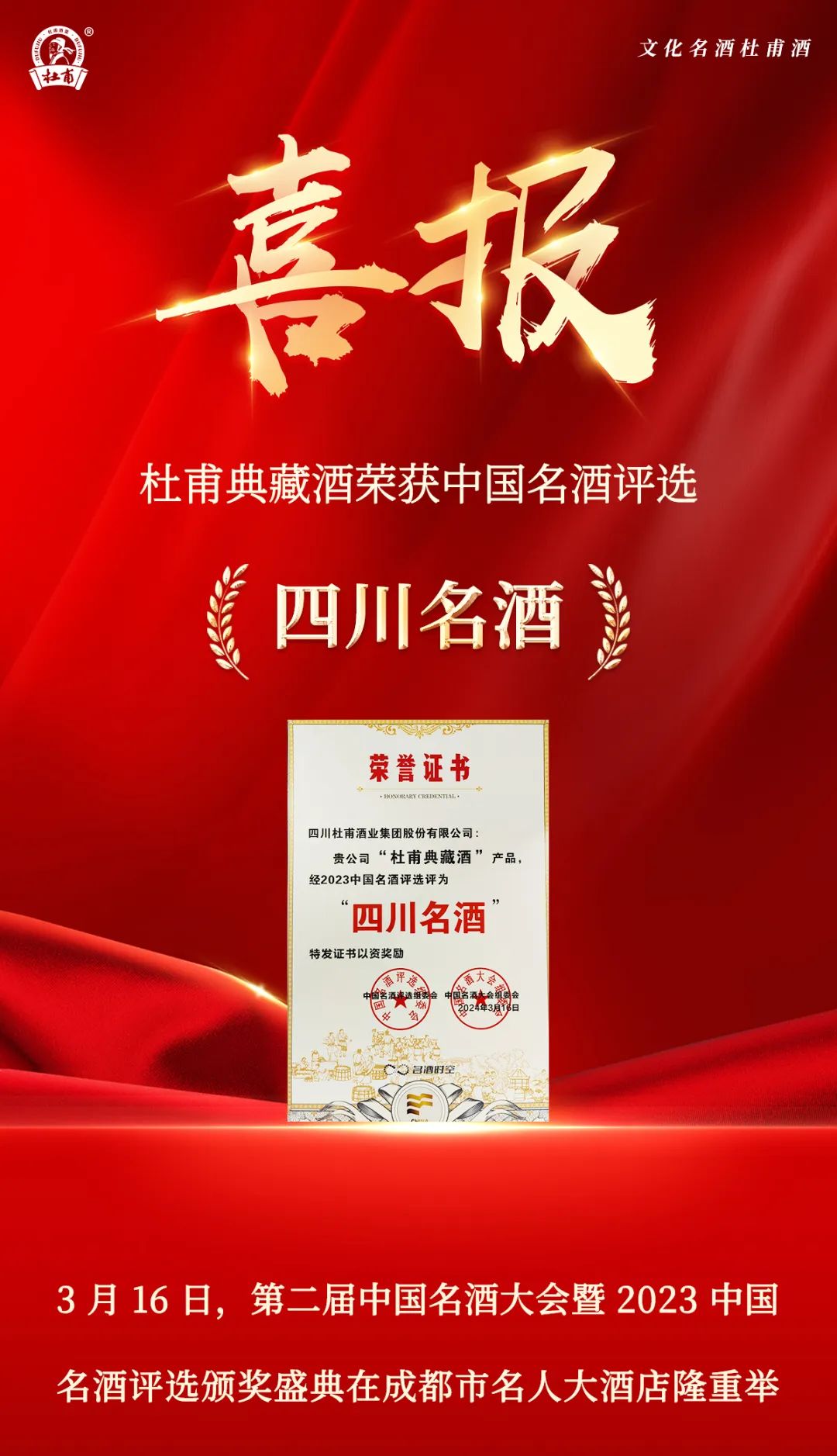 喜报丨杜甫典藏酒荣获中国名酒评选“四川名酒”称号