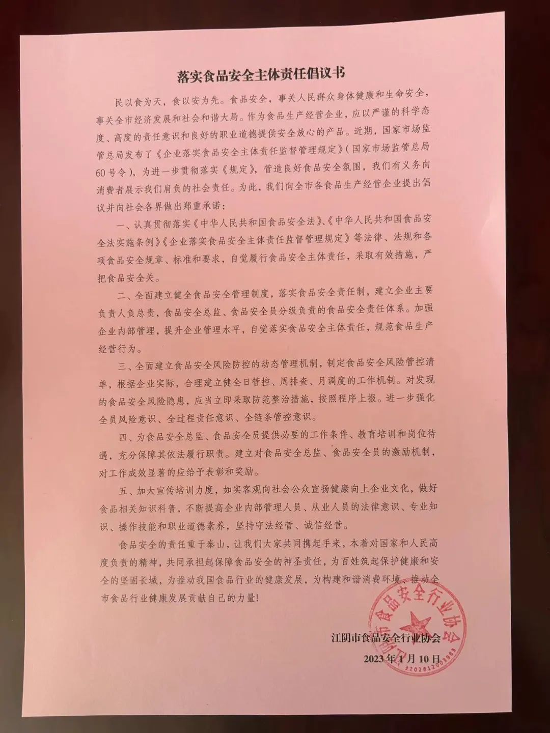 江阴市食品安全行业协会向全体会员企业发出落实食品安全主体责任倡议,进一步督促会员企业落实食品安全主体责任,强化企业主要负责人食品安全责任,规范食品安全管理人员行为。