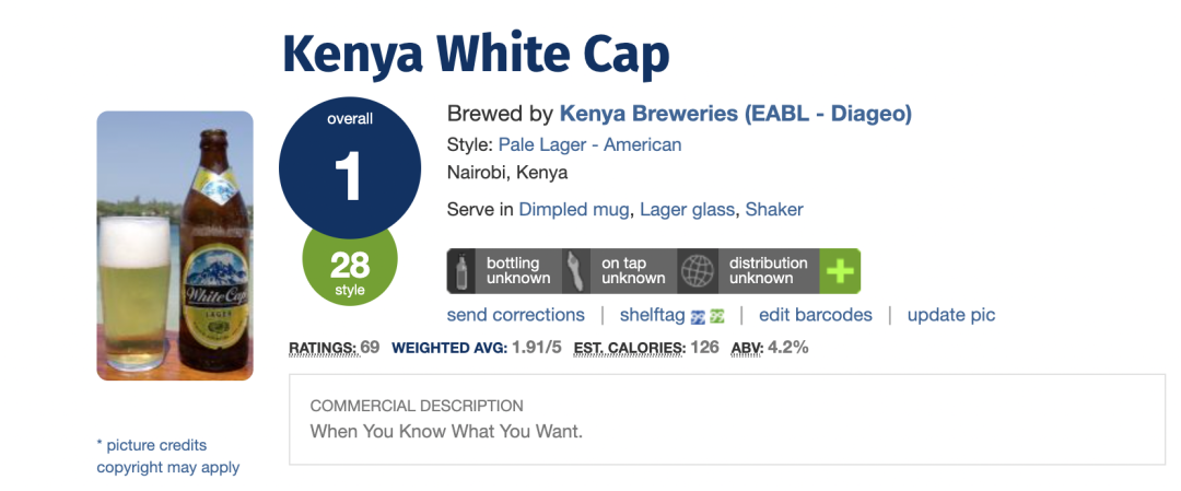 (注:White Cap是肯尼亚的一种啤酒,酒精浓度在4%左右,500毫升一听的售价在260-300肯尼亚先令,示意图如下)