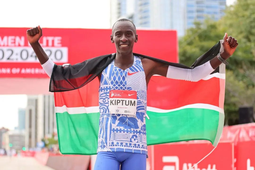 2023年10月8日,凯尔文·基普图姆(Kelvin Kiptum)赛后庆祝,他以2小时35秒夺冠,刷新世界纪录