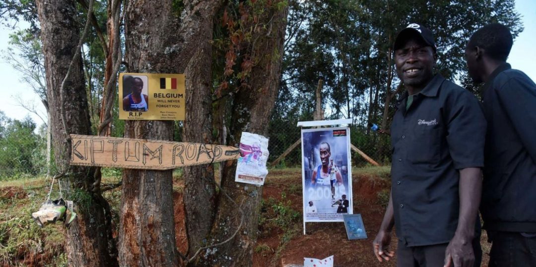 树周围挂满了纪念品、标语牌和海报。还有一双带有许多签名的跑鞋,鞋侧潦草地写着“安息吧基普图姆,你永远在我们的心里”。