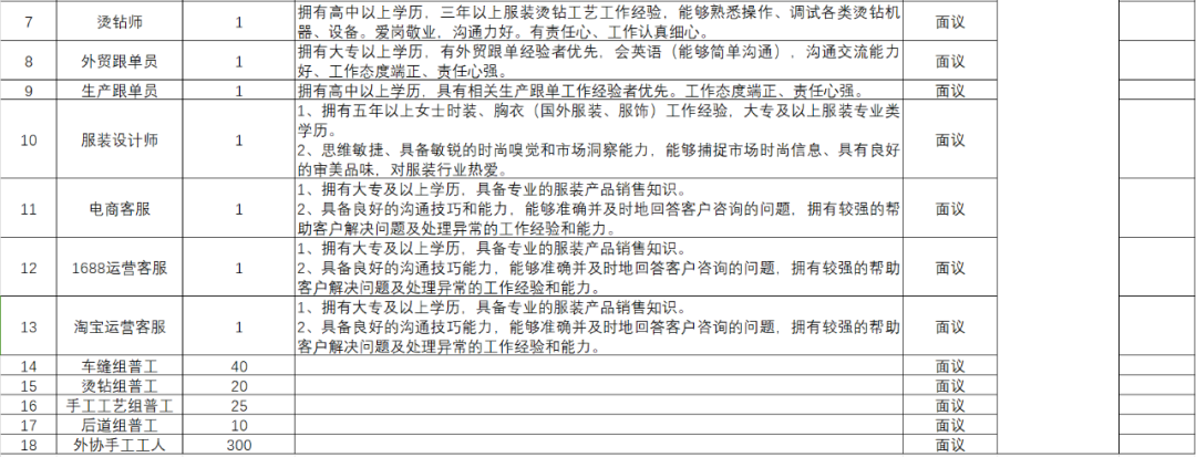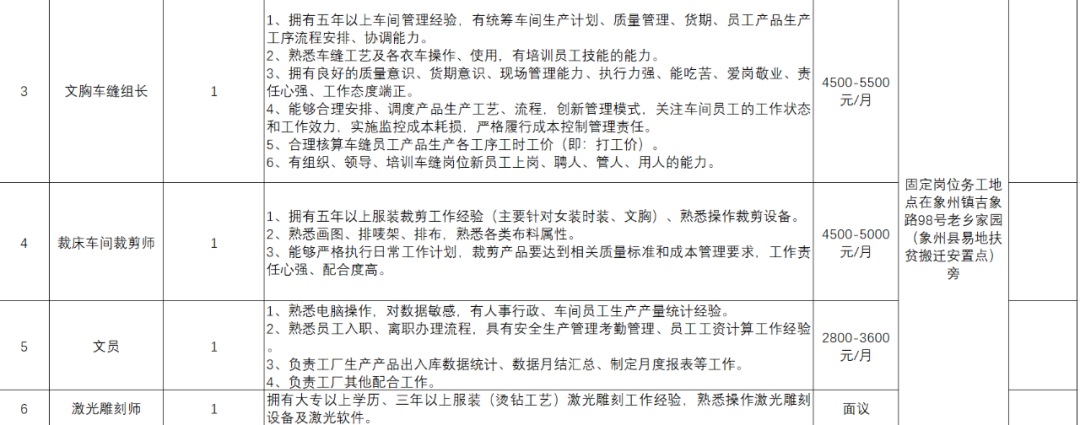 本次招聘共设厂长、时装车缝组长等多种岗位,岗位招聘计划和应聘条件详见附件1《广西家琦服饰制造有限公司岗位需求计划表》。