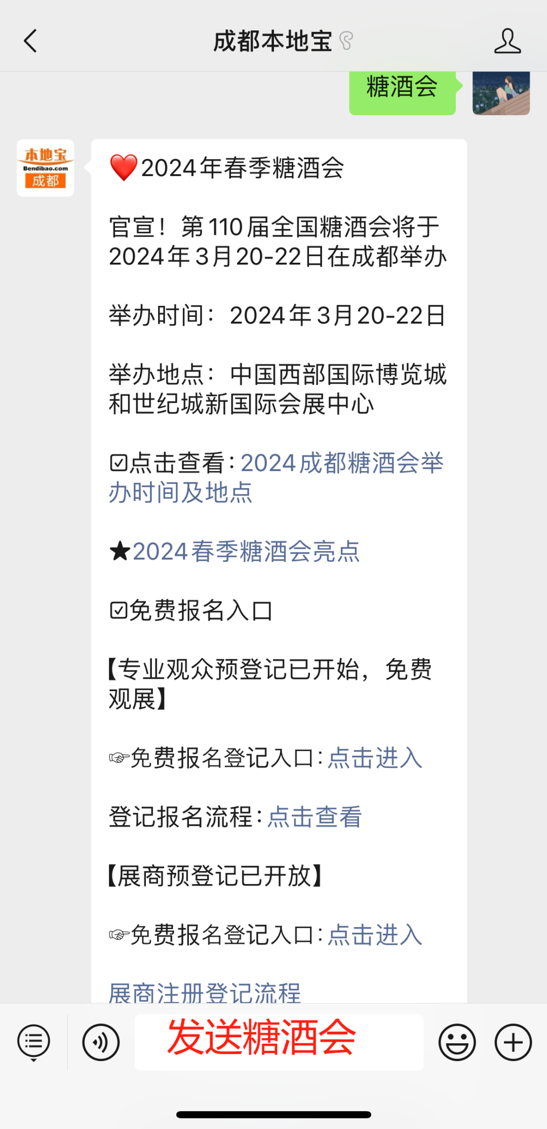 登记入口:进行预登记并免费观展,点击下方链接进入【成都本地宝】公众号,在对话框回复【糖酒会】直接获取免费登记入口、操作流程、购票入口、观展指南等。回复【酒店展】查看目前已开始的酒店展地点、时间、参展商。