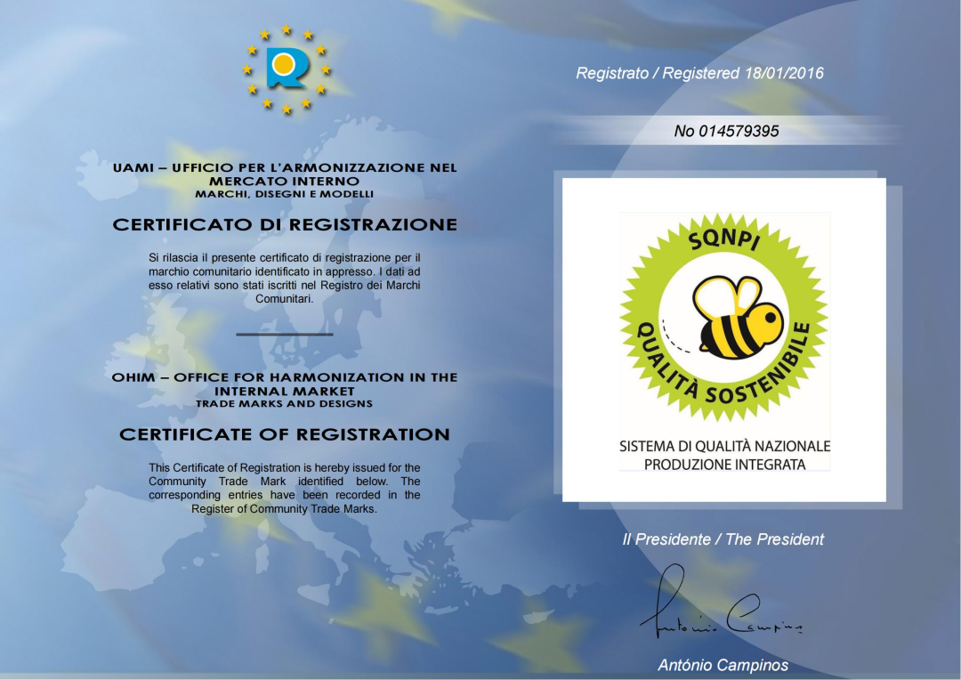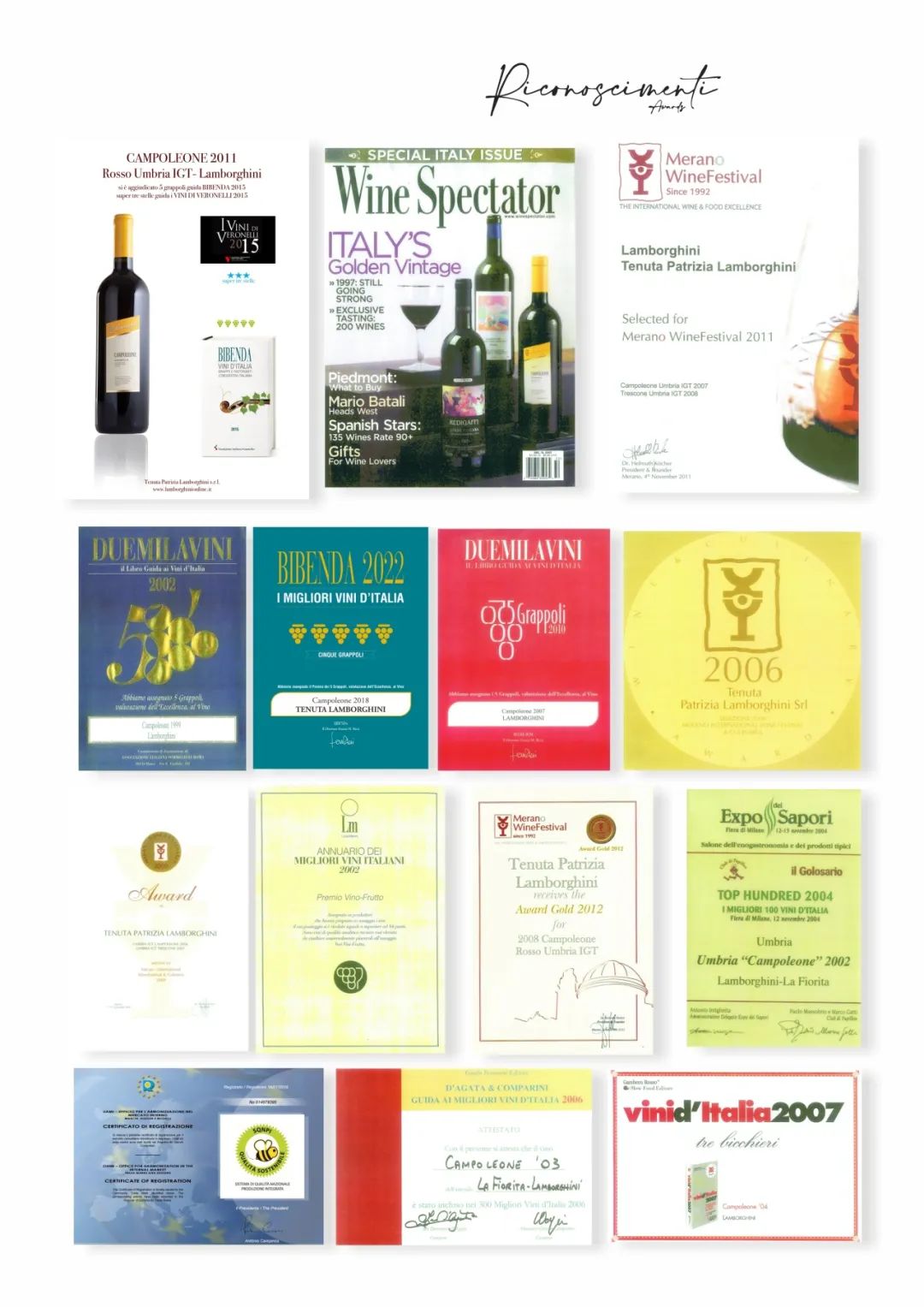 兰博基尼酒庄于2016年1月18日荣获:意大利国家质量体系,可持续质量一体化生产SQNPI证书 编号 014579395 (简称小蜜蜂土地,与中国的无公害的土地类似 ,小蜜蜂证书资质)