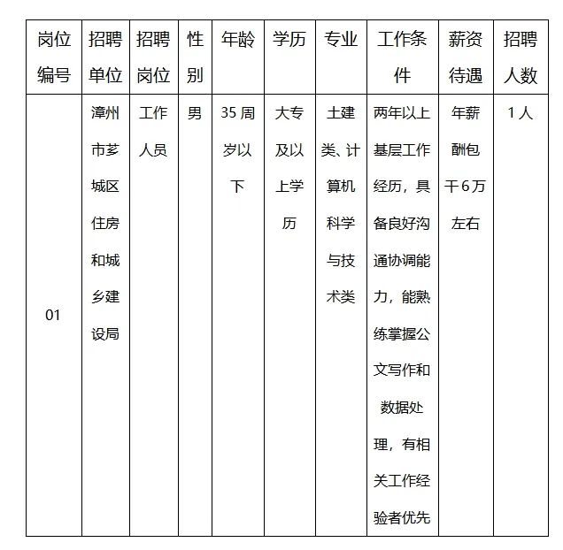 漳州市芗城区住房和城乡建设局拟公开招聘以下岗位。现将招聘工作有关事宜公布如下: