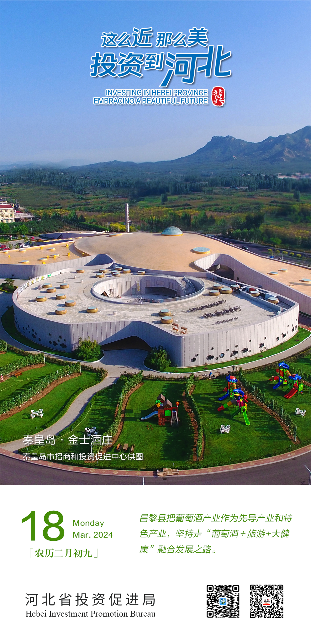 秦皇岛市昌黎县把葡萄酒产业作为支柱产业、特色产业来抓,举全县之力,持续推进葡萄酒产业精品化、高端化步伐,逐步向国际化迈进。同时,昌黎县把葡萄酒产业作为先导产业,坚持走“葡萄酒+旅游+大健康”融合发展之路。