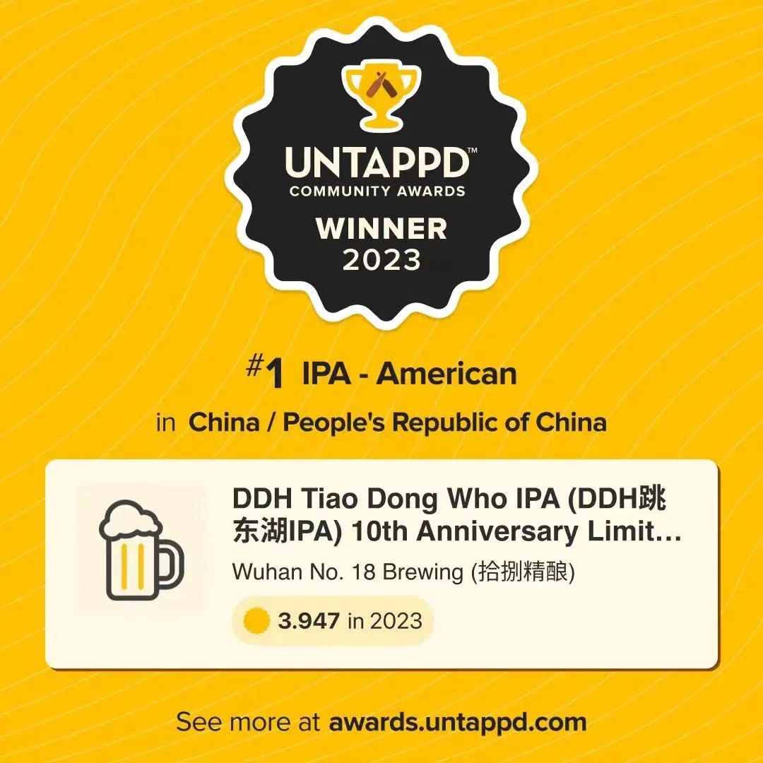 Untappd首次发布社区奖项,以庆祝2023年被1100万用户认可的数千家优秀啤酒厂和啤酒,跳东湖DDH IPA获得中国地区美式IPA组第一名。